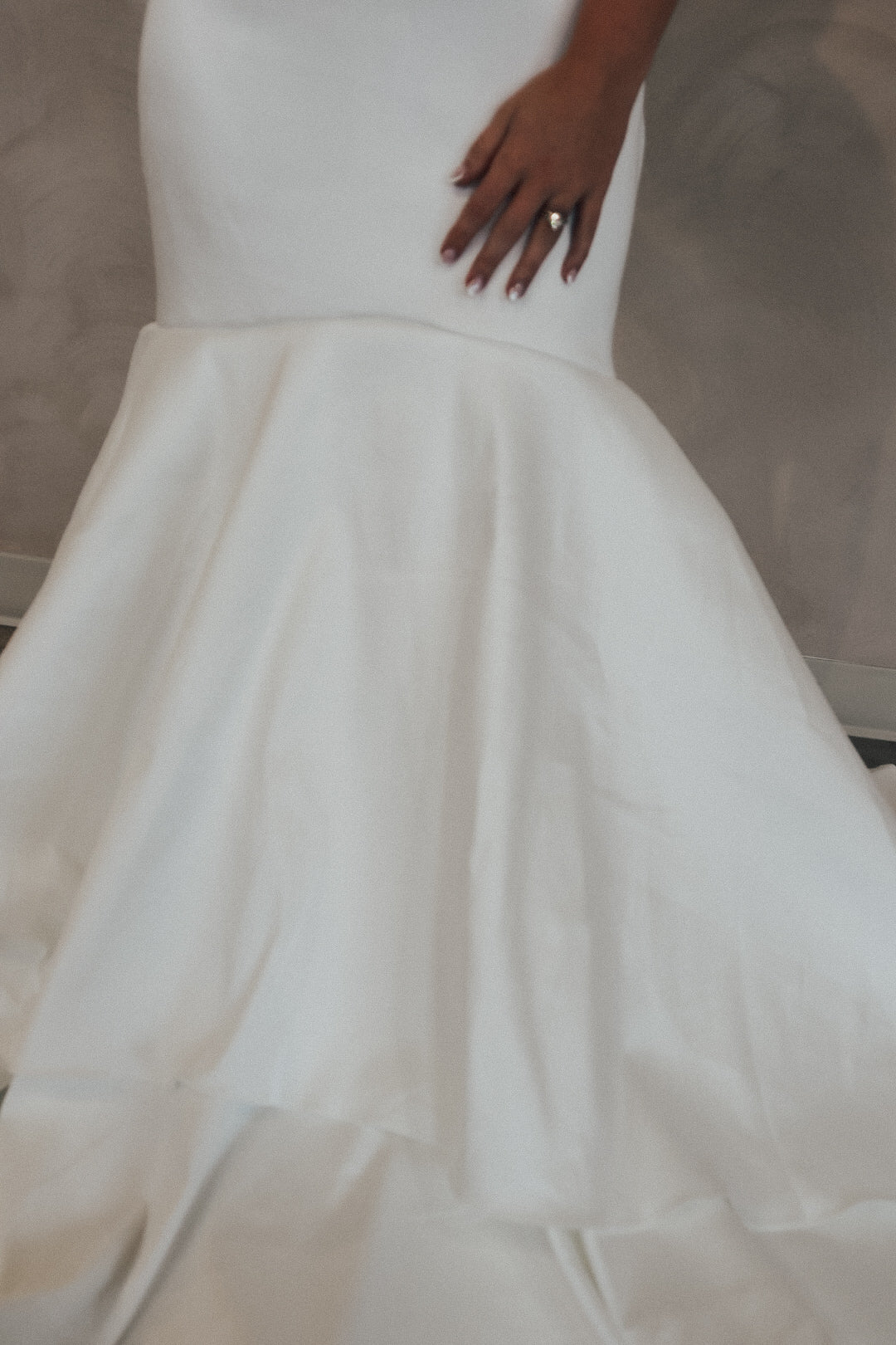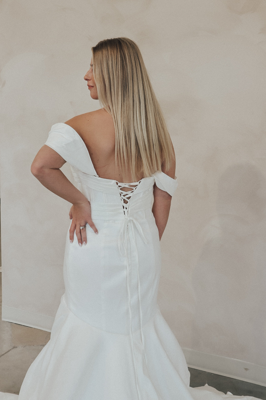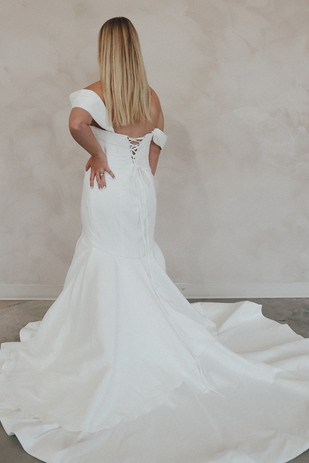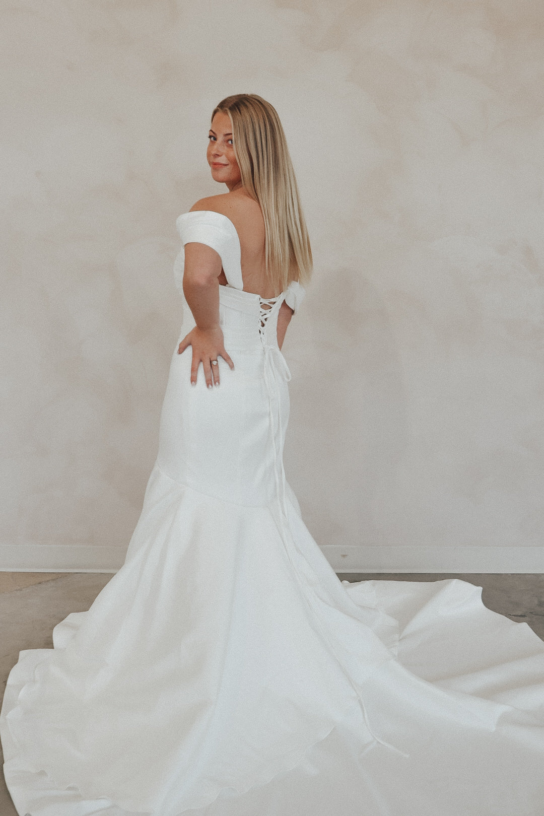 Sunday is a modern classic with a touch of romance — a clean, structured satin gown designed with effortless elegance in mind. The off-the-shoulder neckline drapes softly across the arms, creating a timeless portrait shape while still feeling fresh and current. Strategic pleating through the bodice adds dimension and flatters the waist, leading into a fitted silhouette that flares into a dramatic, sweeping train.