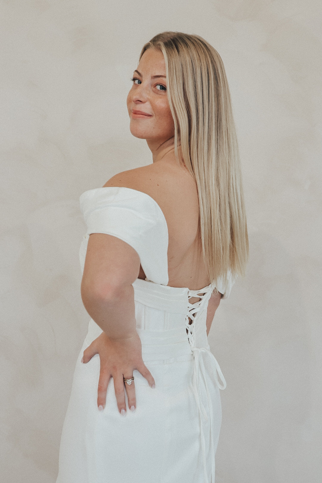 The lace-up back offers an adjustable, corseted fit (hello, comfort + snatched waist), while the matte satin fabric gives Sunday her refined, minimal-luxury feel. She’s the perfect blend of simple, sculpted, and statement-making — ideal for the bride who wants something classic but not predictable.