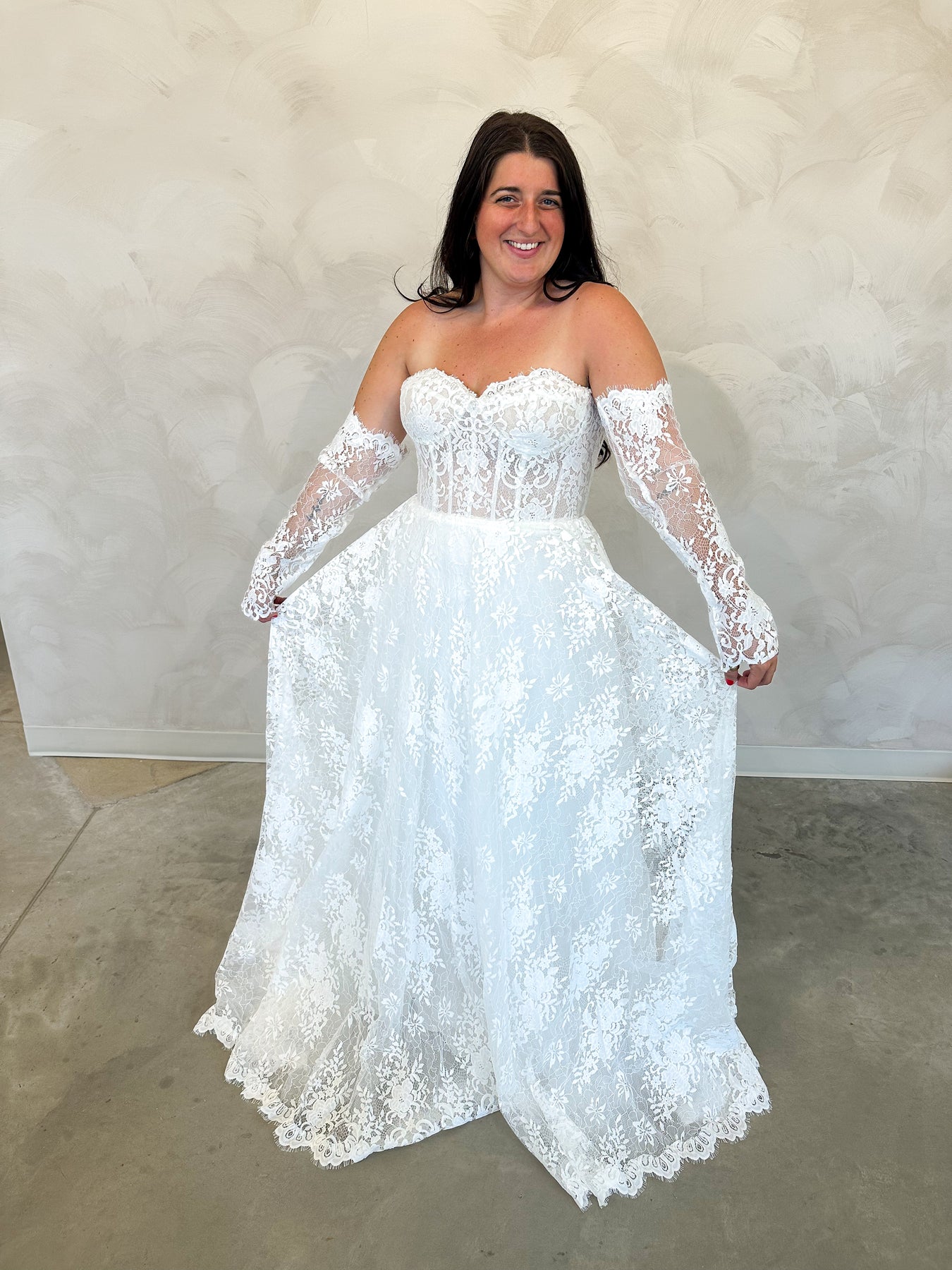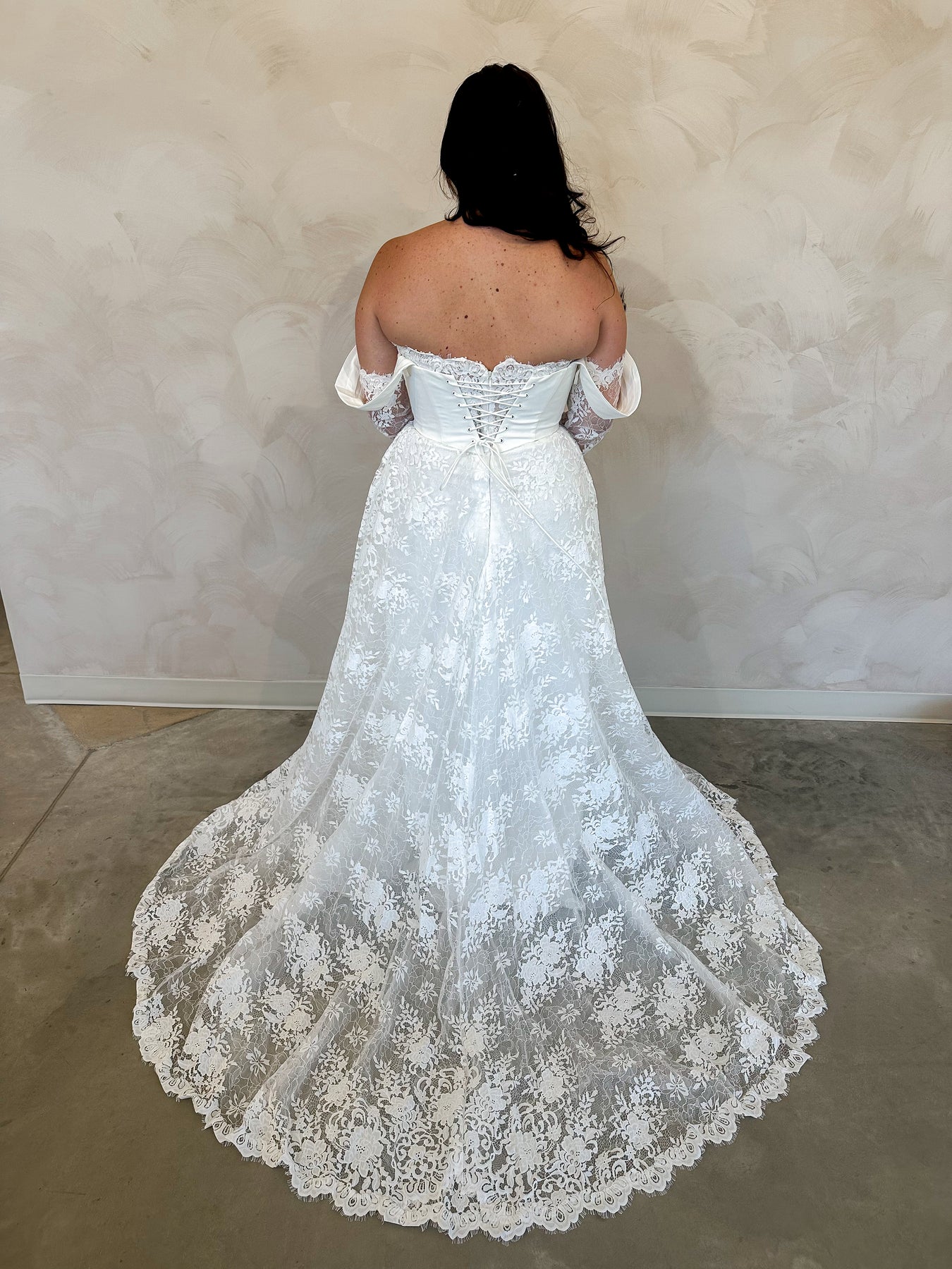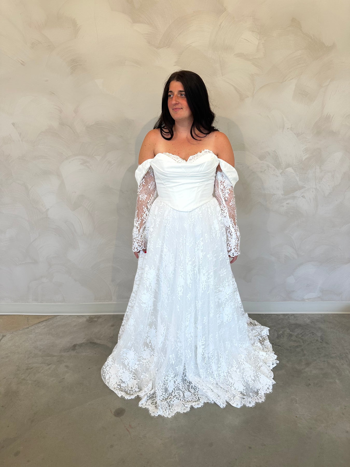 The sweetheart neckline and optional off-the-shoulder sleeves let you personalize your bridal look, whether you're aiming for sultry, soft, or somewhere in between. The delicate lace sleeves add just the right touch of drama while keeping things light and wearable.