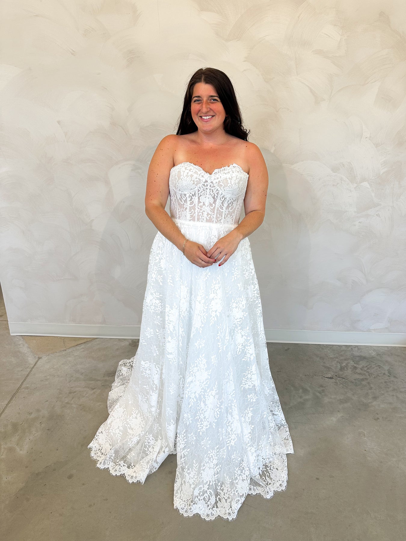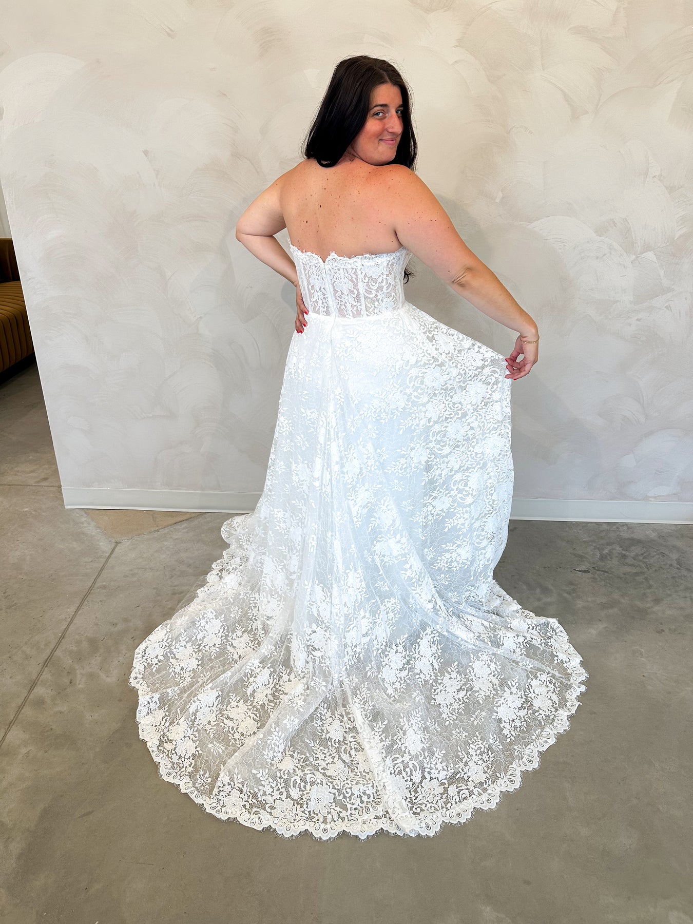 Meet "Valencia"- Romantic, versatile, and effortlessly elegant — Valencia is designed for the bride who wants a timeless look with a modern twist. This gown features a fully boned crepe corset for structure and support, layered beneath a soft floral lace overlay that extends into a full A-line skirt with beautiful movement.