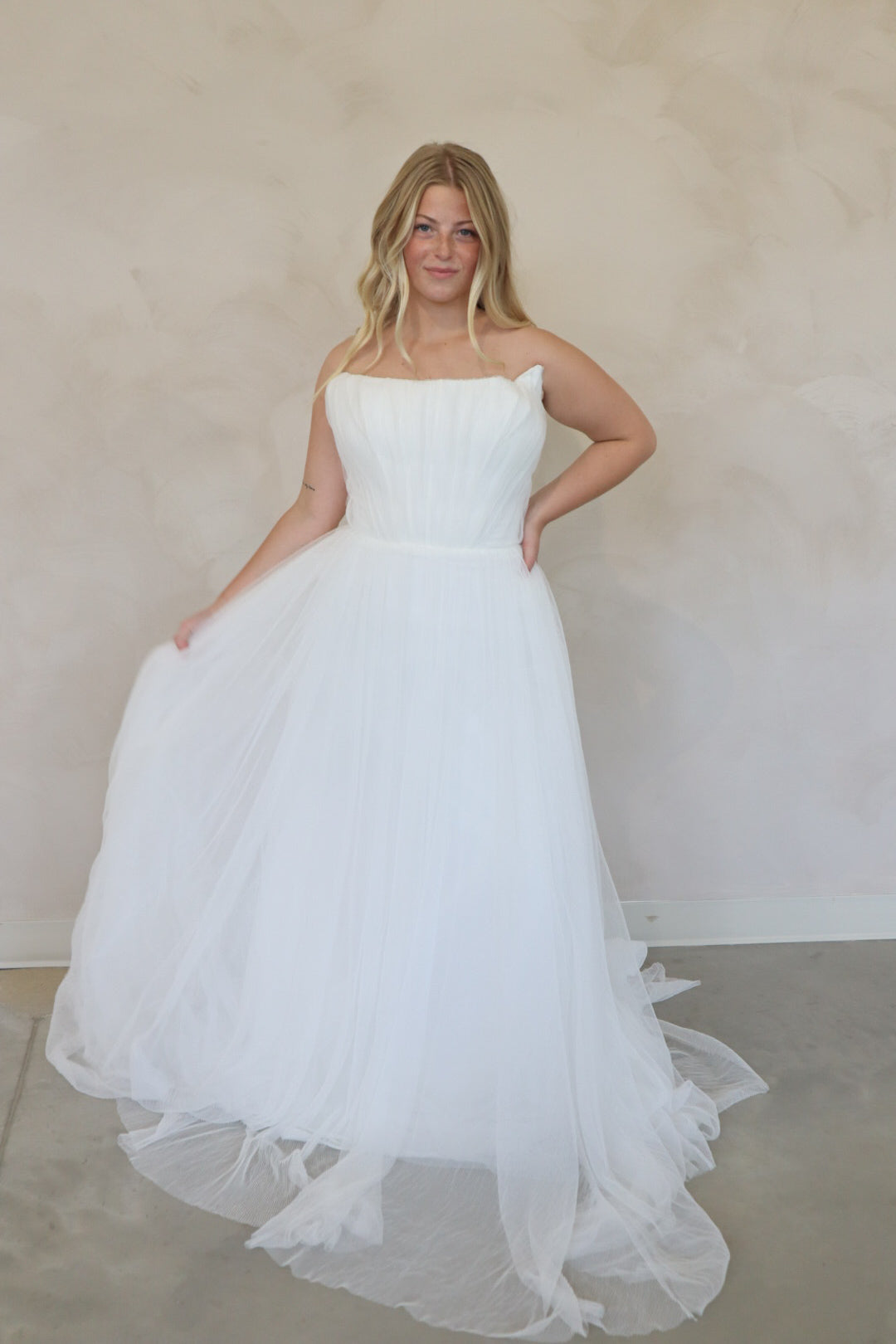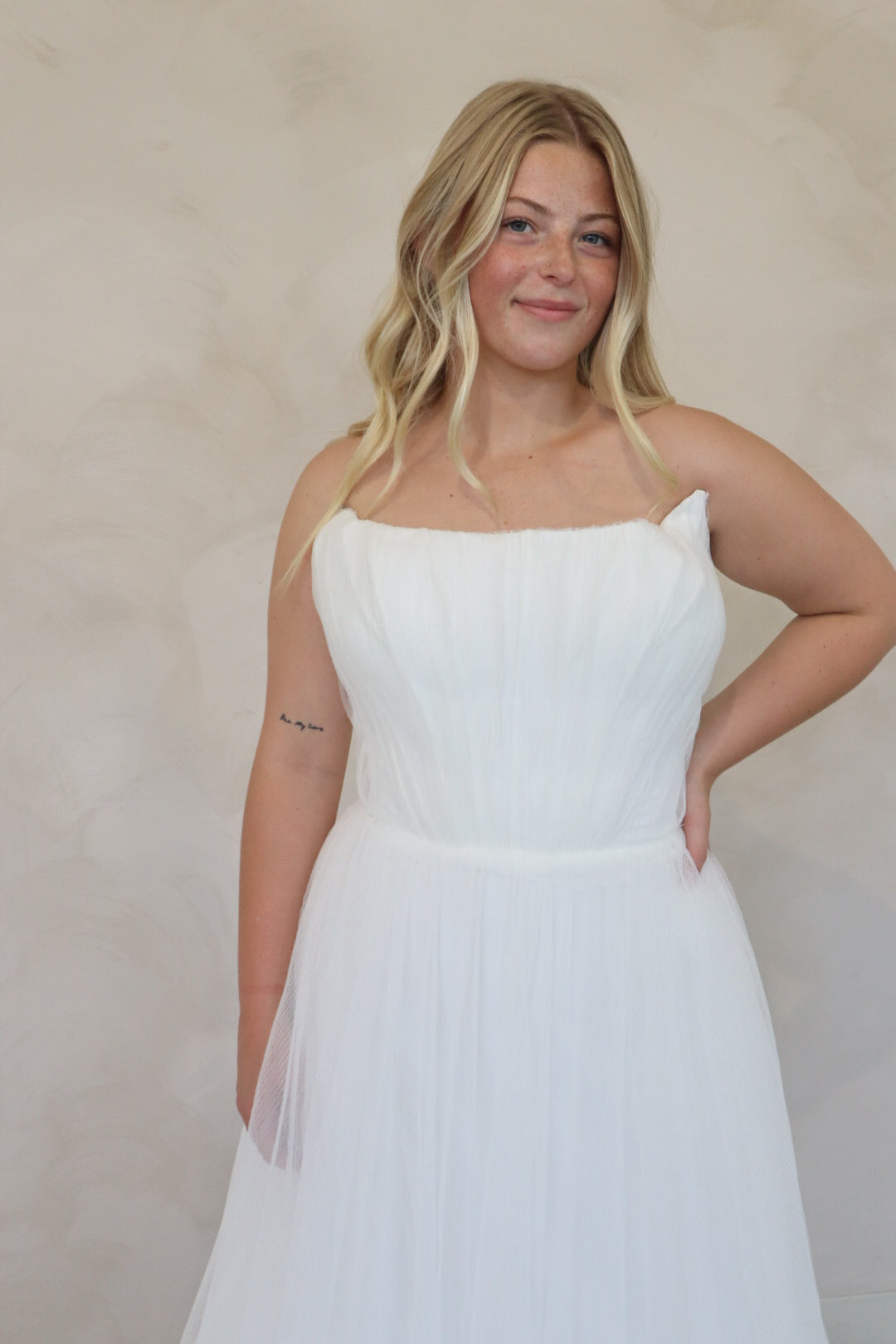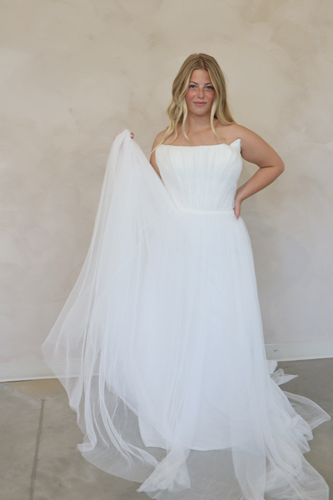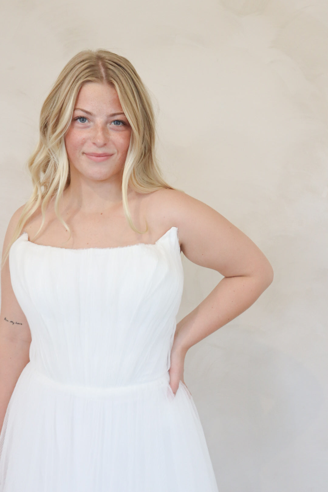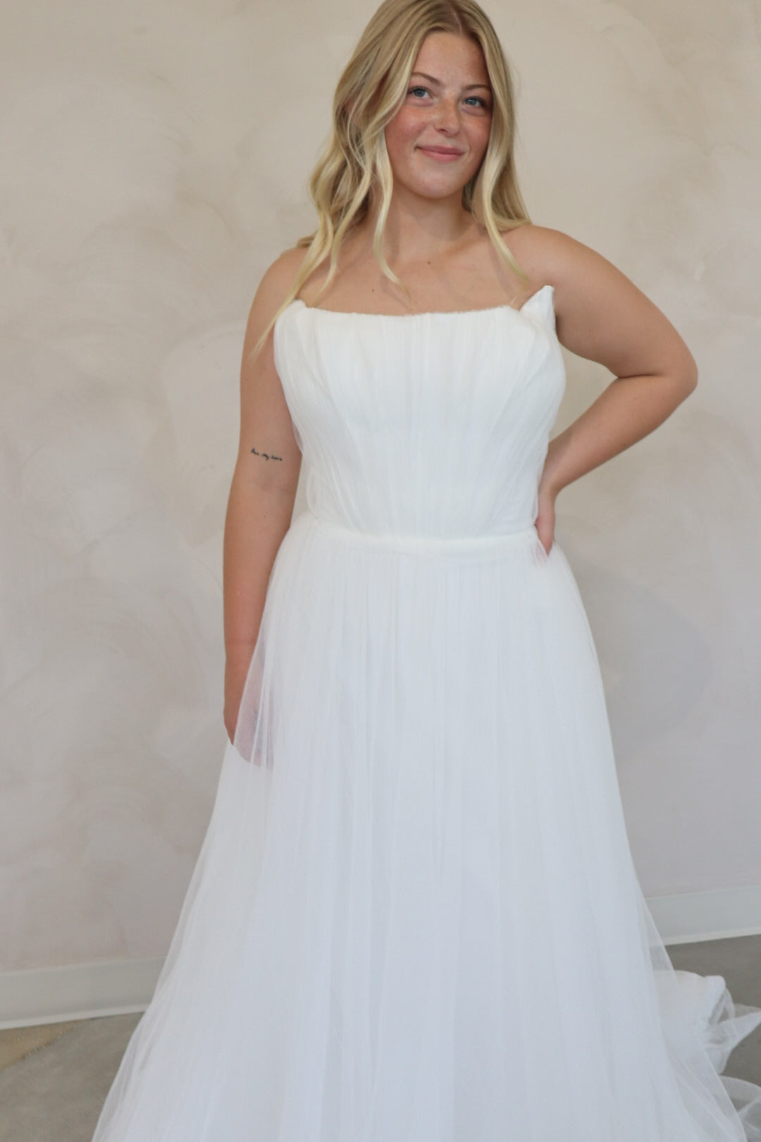 Introducing "Walker" - a stunning a line gown with a flattering scoop cat eye neckline. This gown embodies what a whimsical bride dreams of. The pleated tulle gives the simple gown an ethereal touch, perfect for the bride who dreams of a lightweight yet flowing gown. The small sweep train on this gown dances right around the end of the dress. The customizations on this simple, whimsical gown are endless.