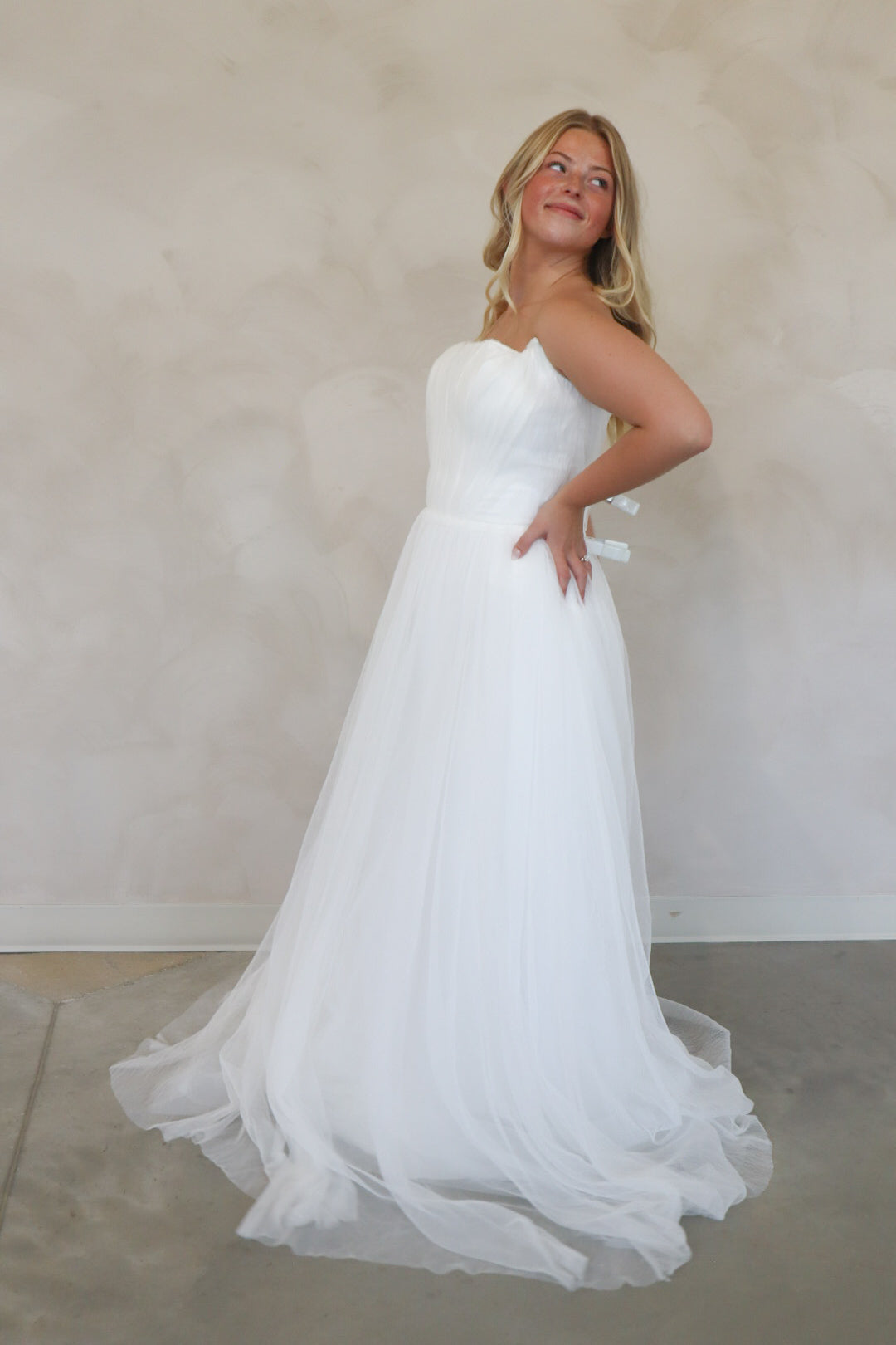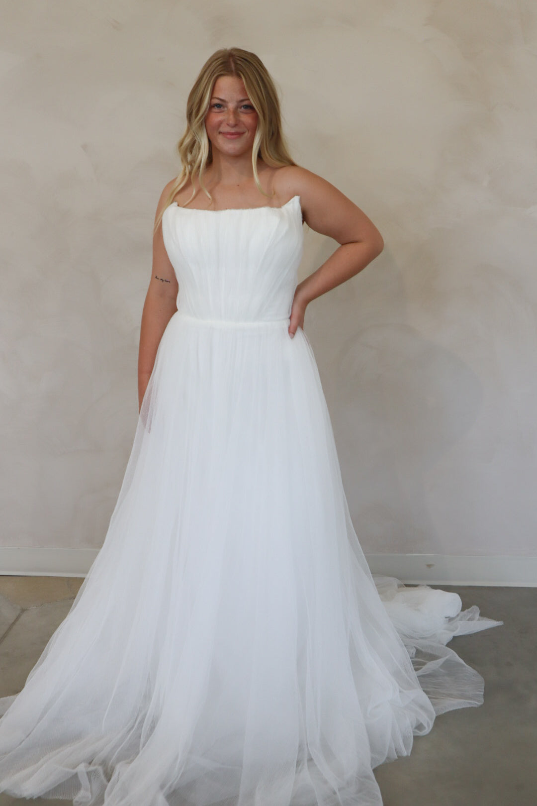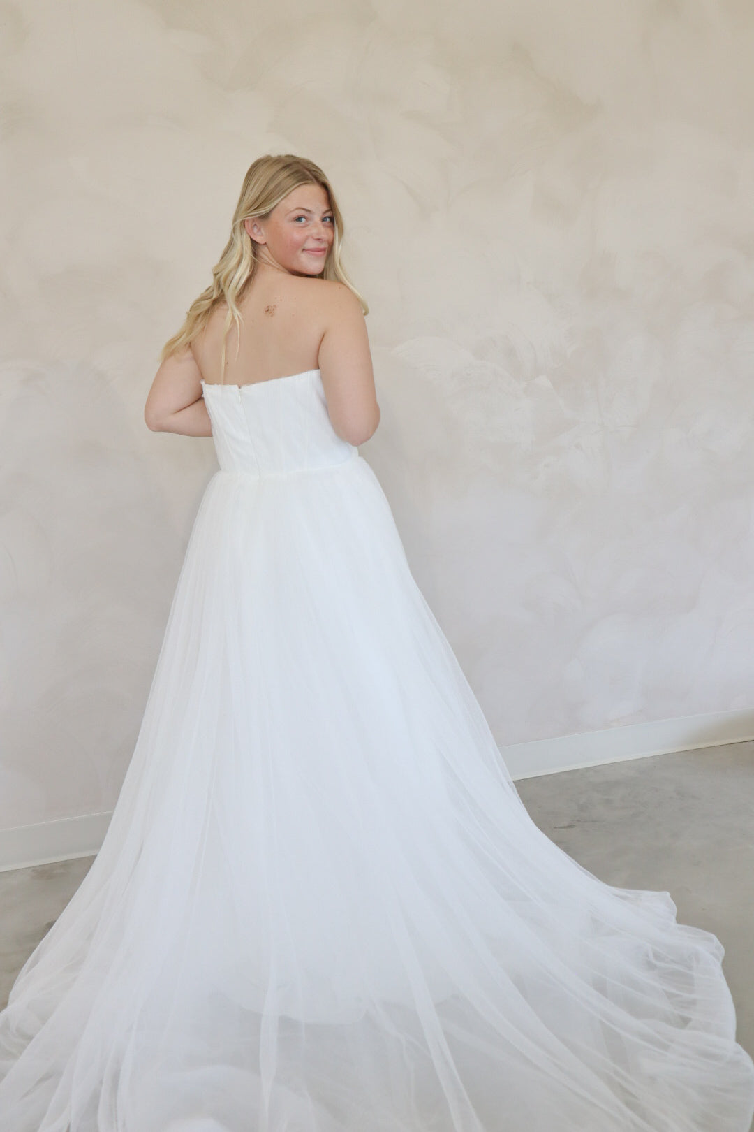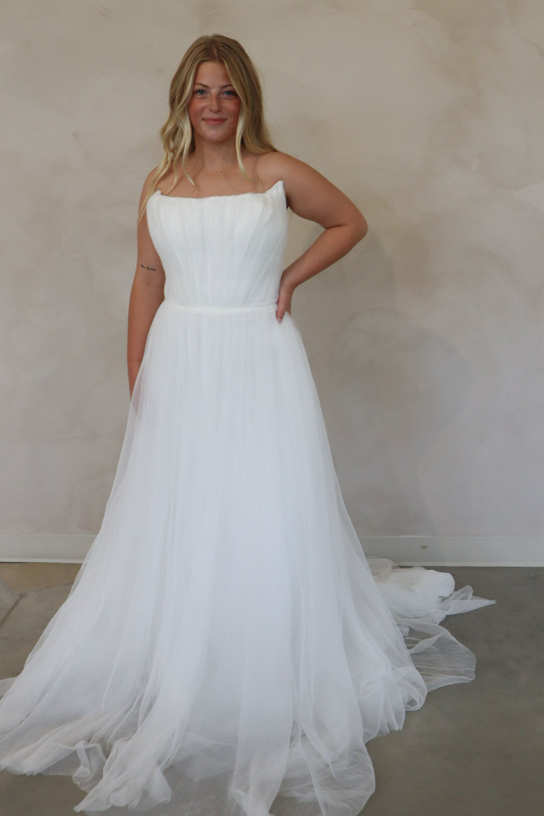Introducing "Walker" - a stunning a line gown with a flattering scoop cat eye neckline. This gown embodies what a whimsical bride dreams of. The pleated tulle gives the simple gown an ethereal touch, perfect for the bride who dreams of a lightweight yet flowing gown. The small sweep train on this gown dances right around the end of the dress. The customizations on this simple, whimsical gown are endless.