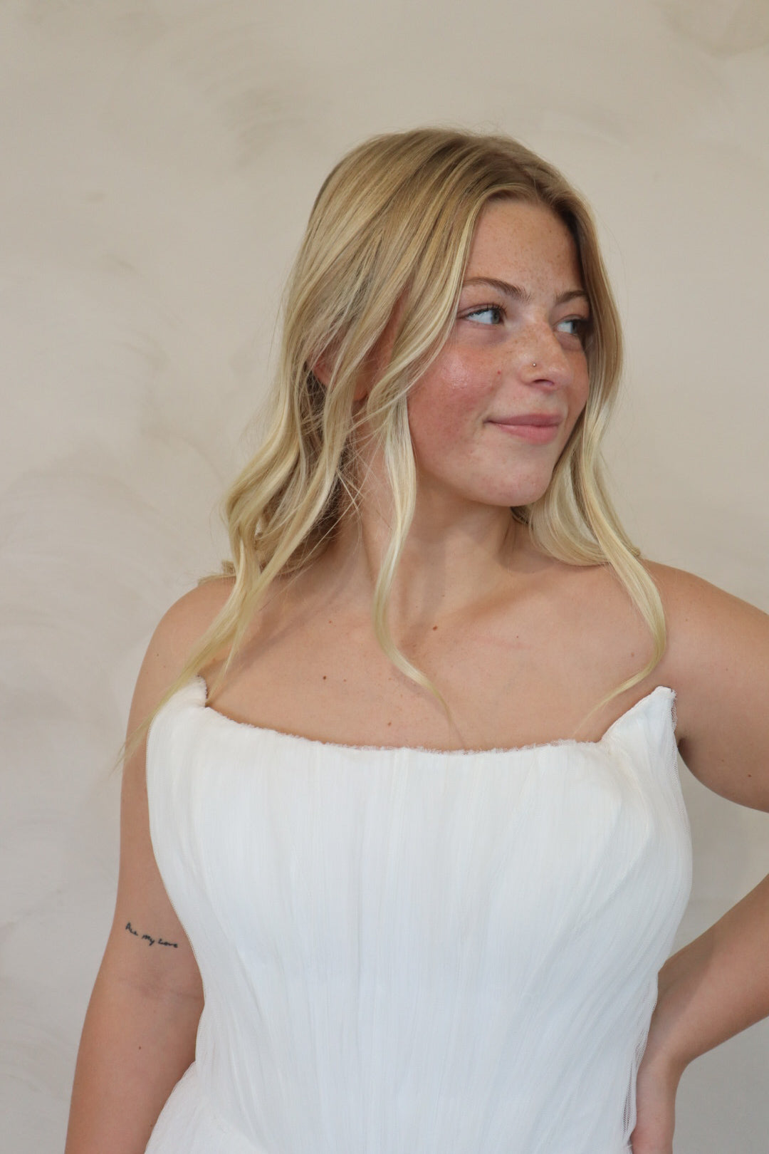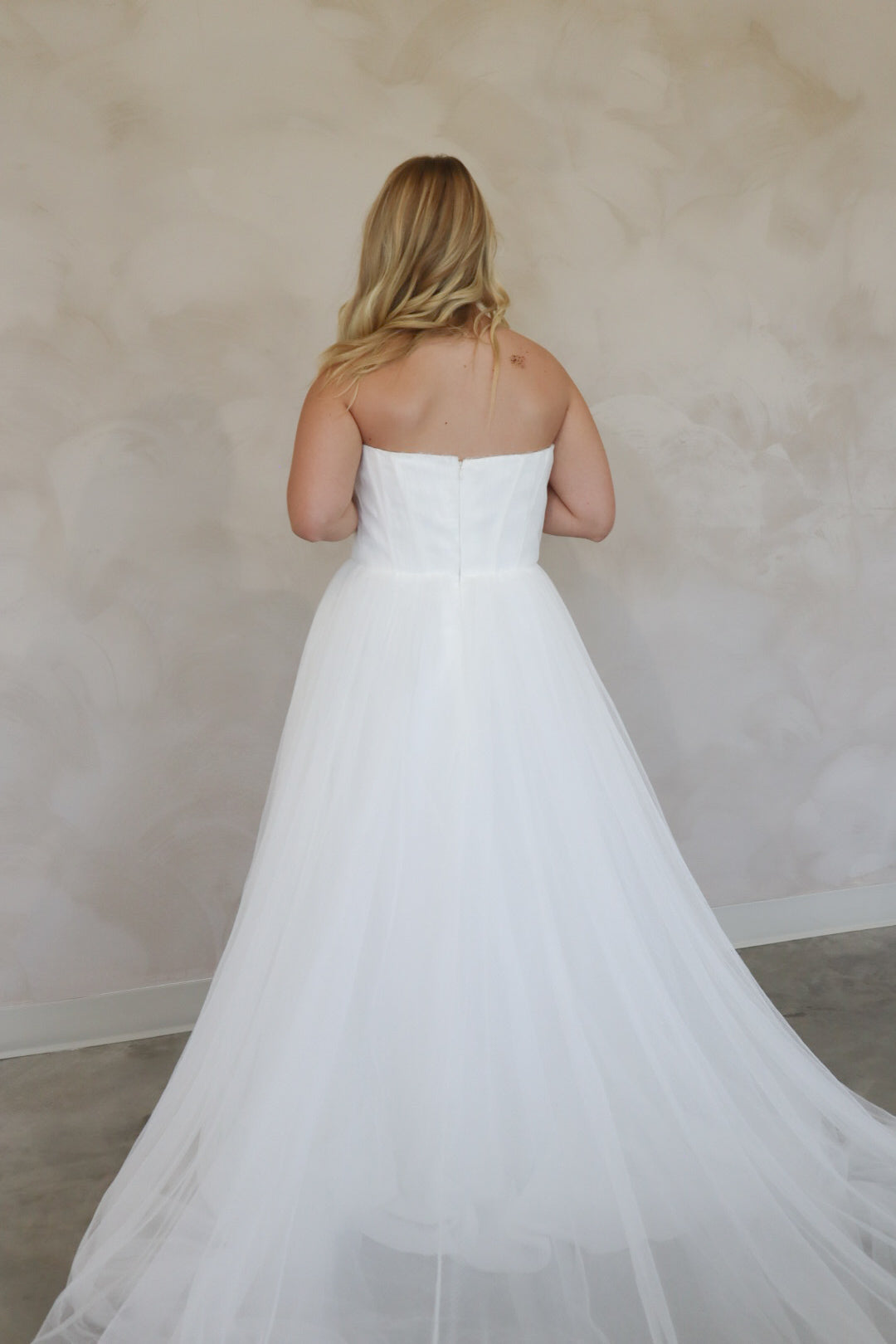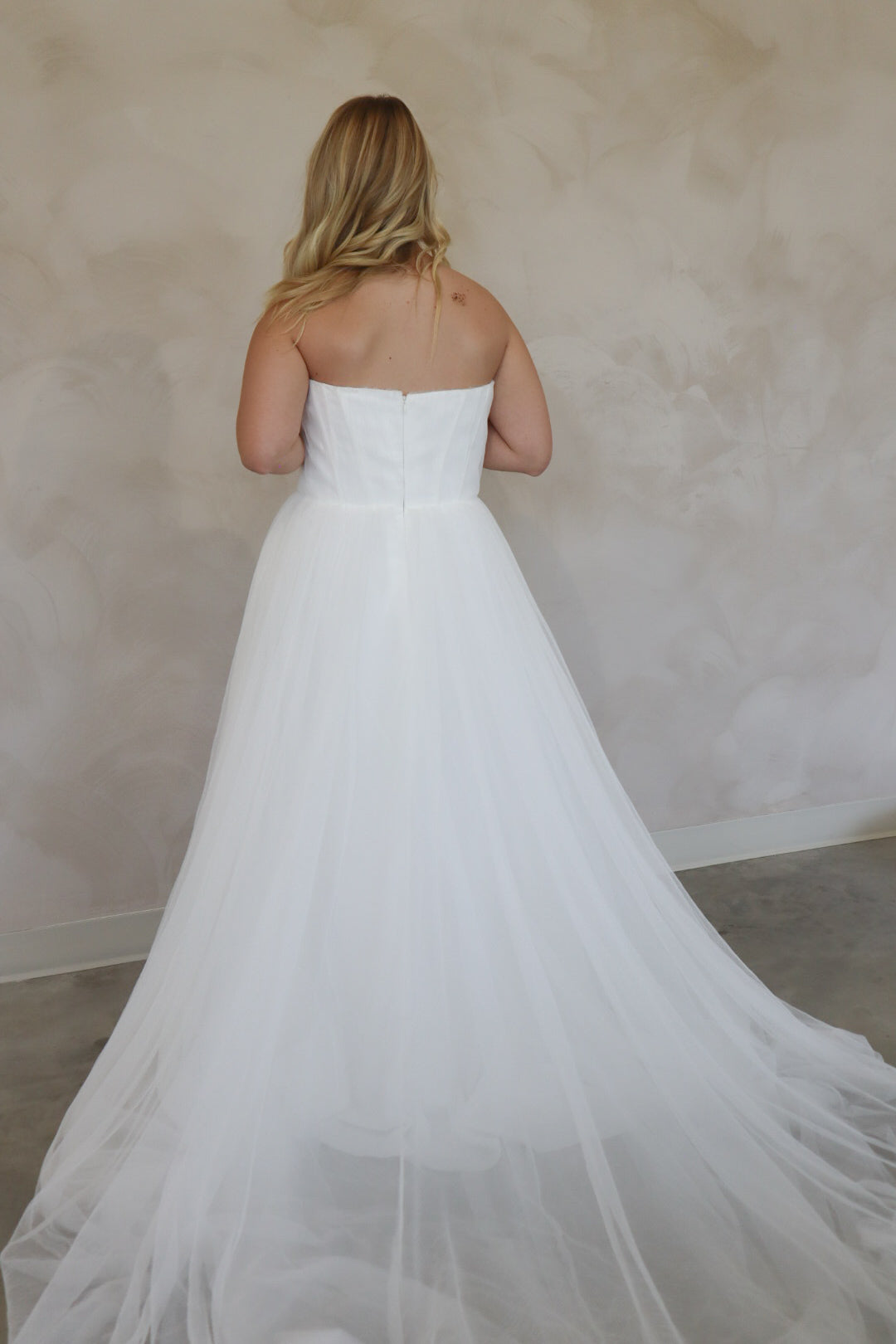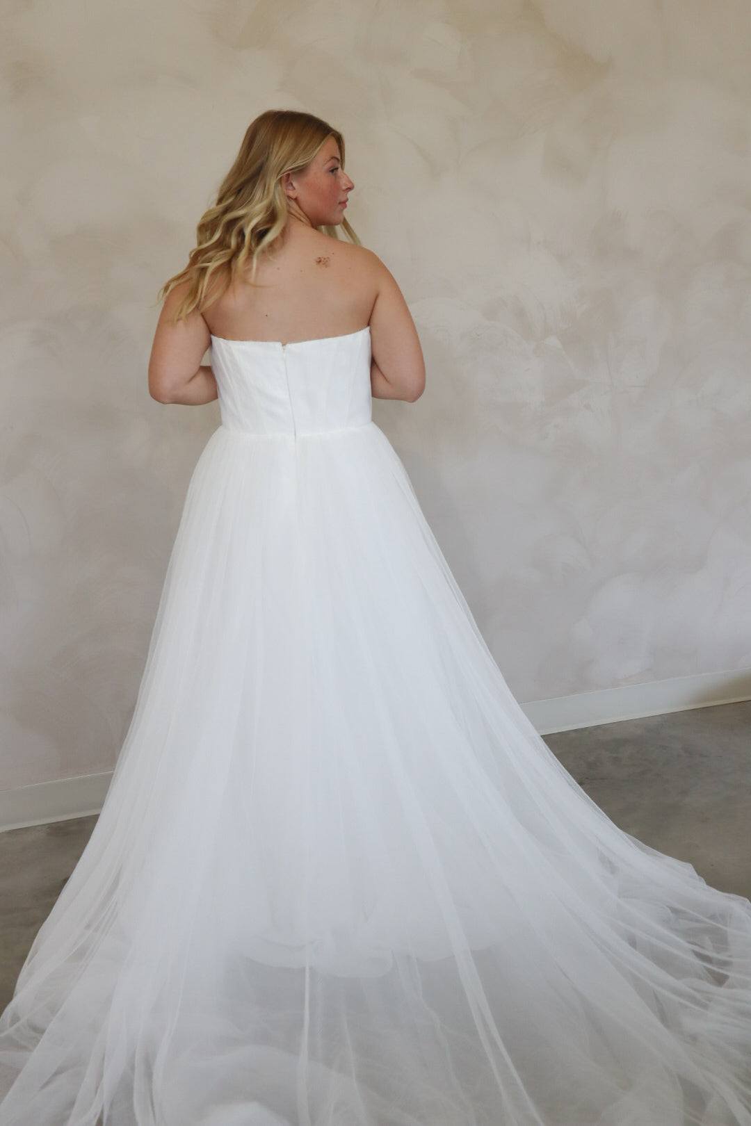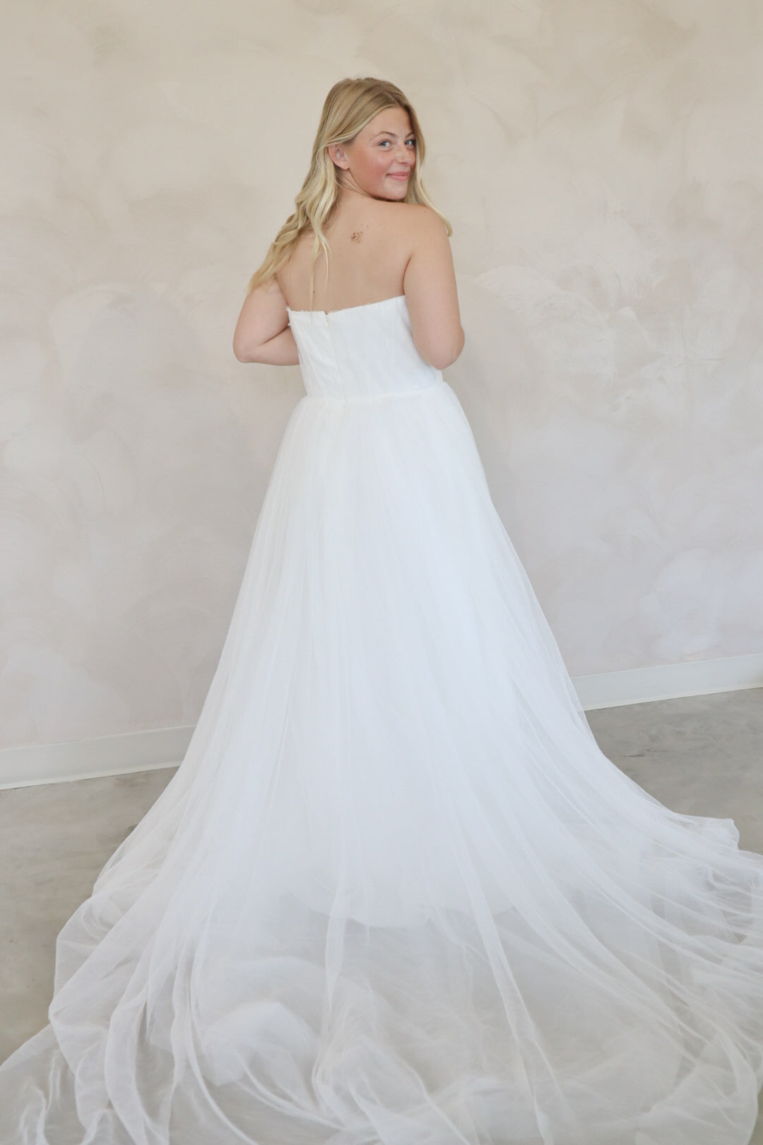 Introducing "Walker" - a stunning a line gown with a flattering scoop cat eye neckline. This gown embodies what a whimsical bride dreams of. The pleated tulle gives the simple gown an ethereal touch, perfect for the bride who dreams of a lightweight yet flowing gown. The small sweep train on this gown dances right around the end of the dress. The customizations on this simple, whimsical gown are endless.