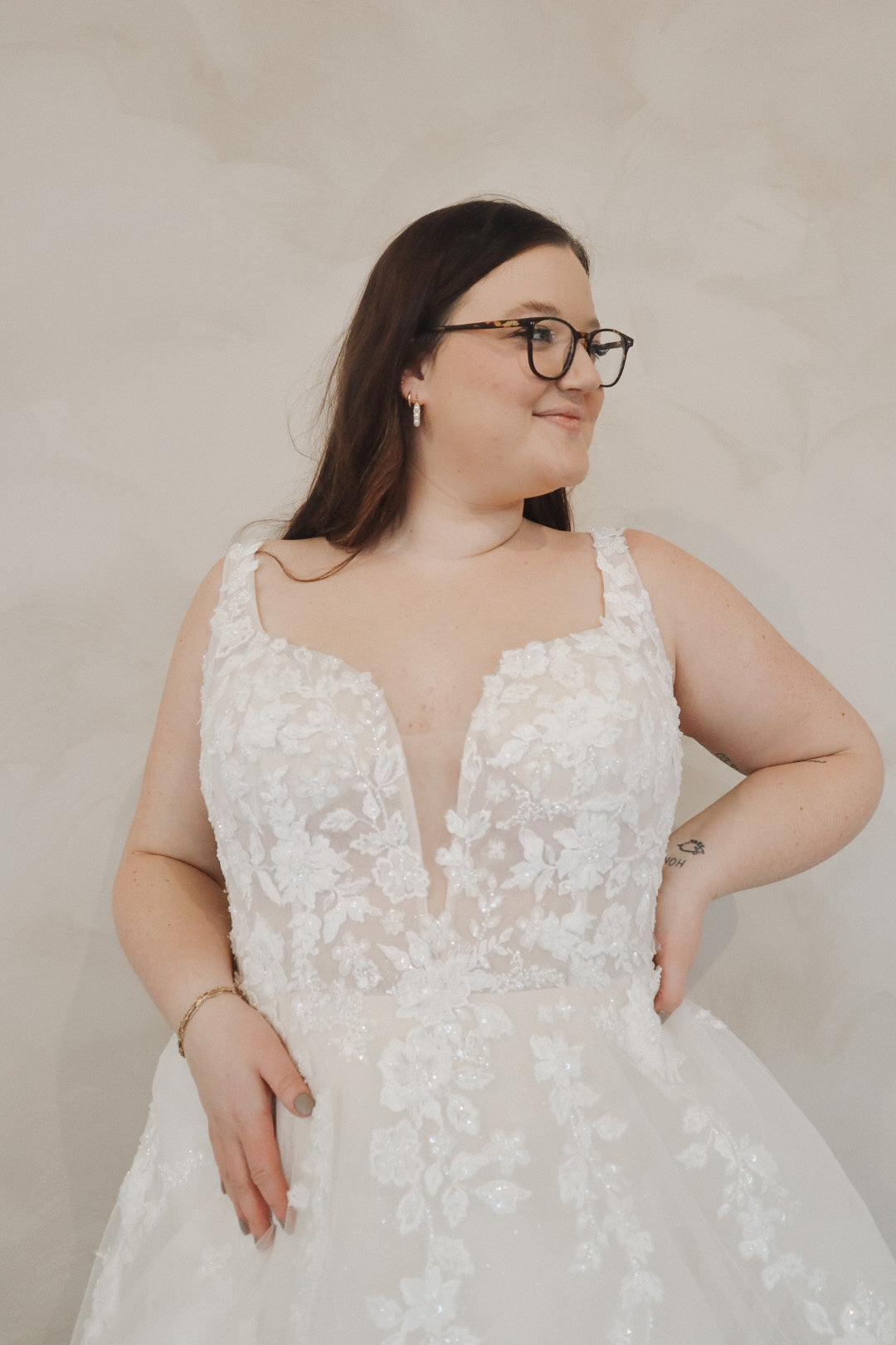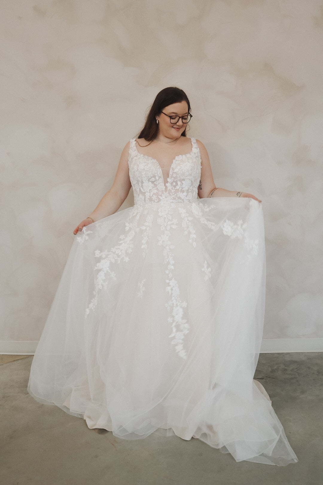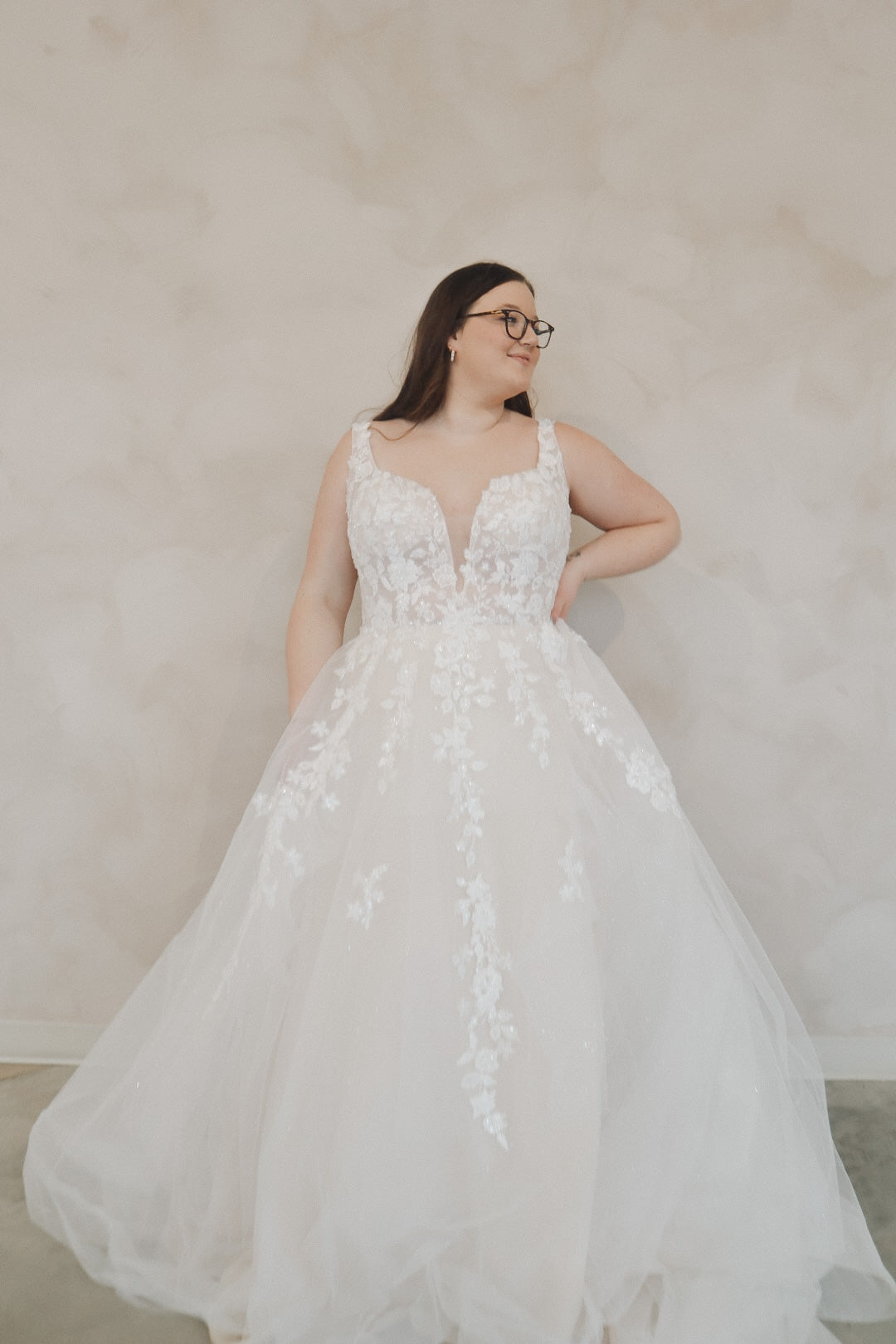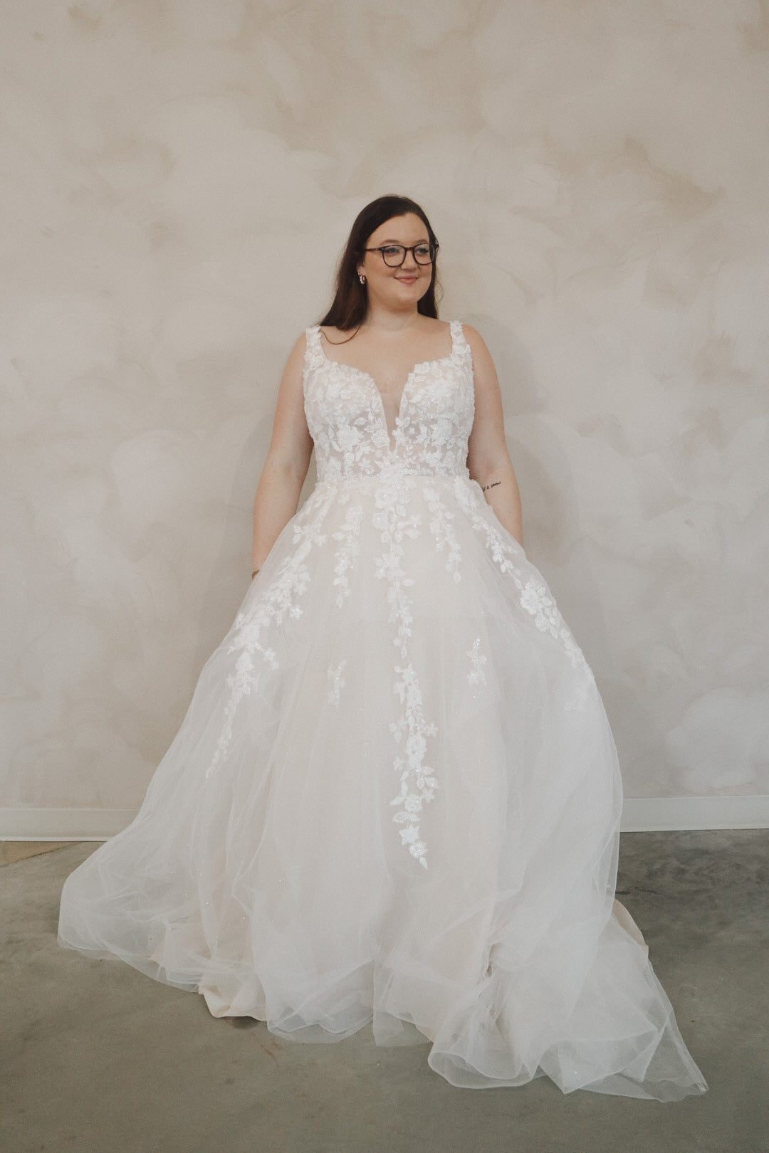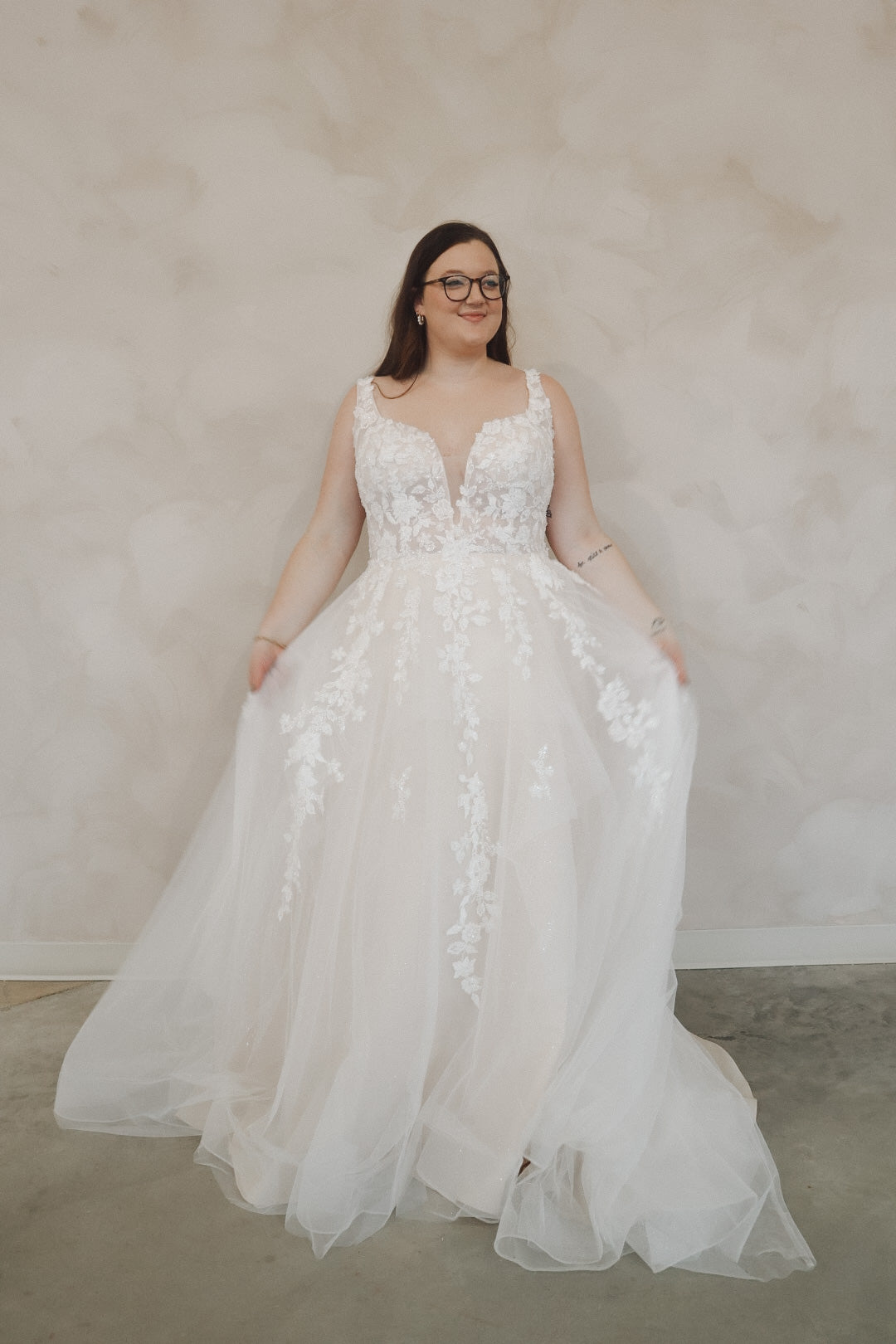 Introducing "Wrigley"- This dress is absolutely stunning, combining a romantic feel with a modern, flattering silhouette. The deep sweetheart neckline and intricate lace details give a soft and feminine vibe, while the voluminous tulle skirt adds drama and elegance. The flowy, ethereal design captures movement beautifully, making it a perfect choice for a bride who wants to feel both majestic and free-spirited on her big day. The mix of delicate lace and airy fabric creates a magical, timeless look—perfect for a fairytale wedding.