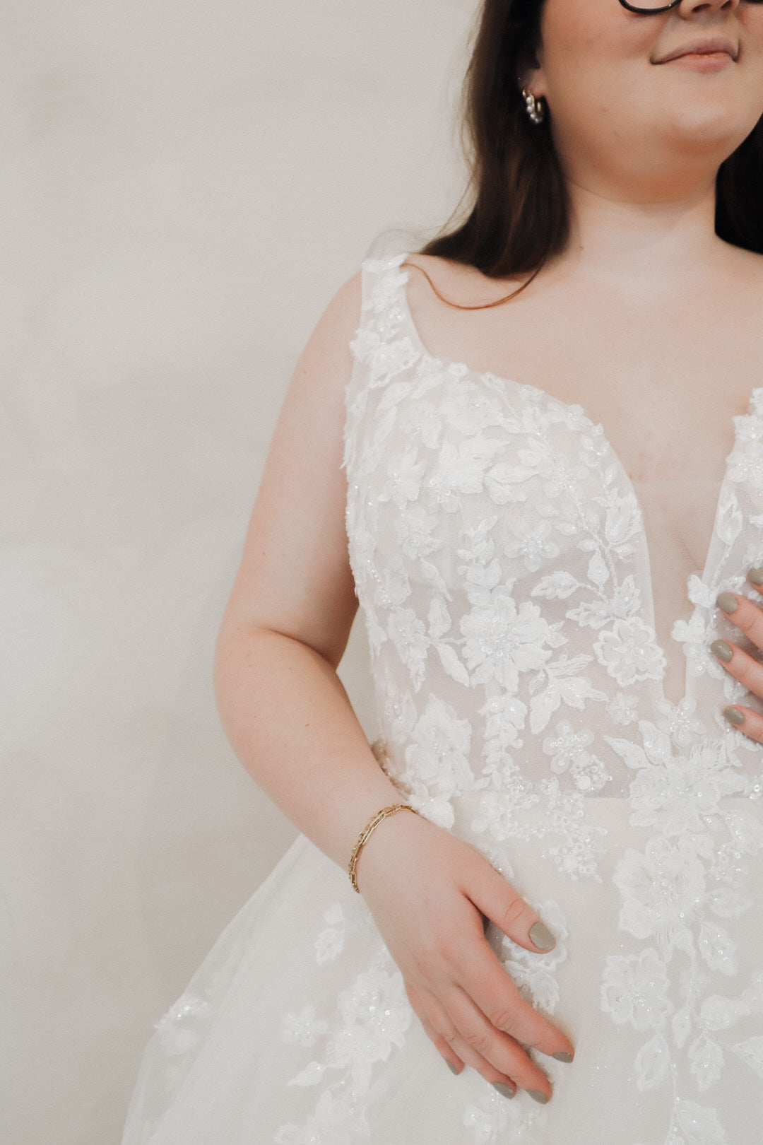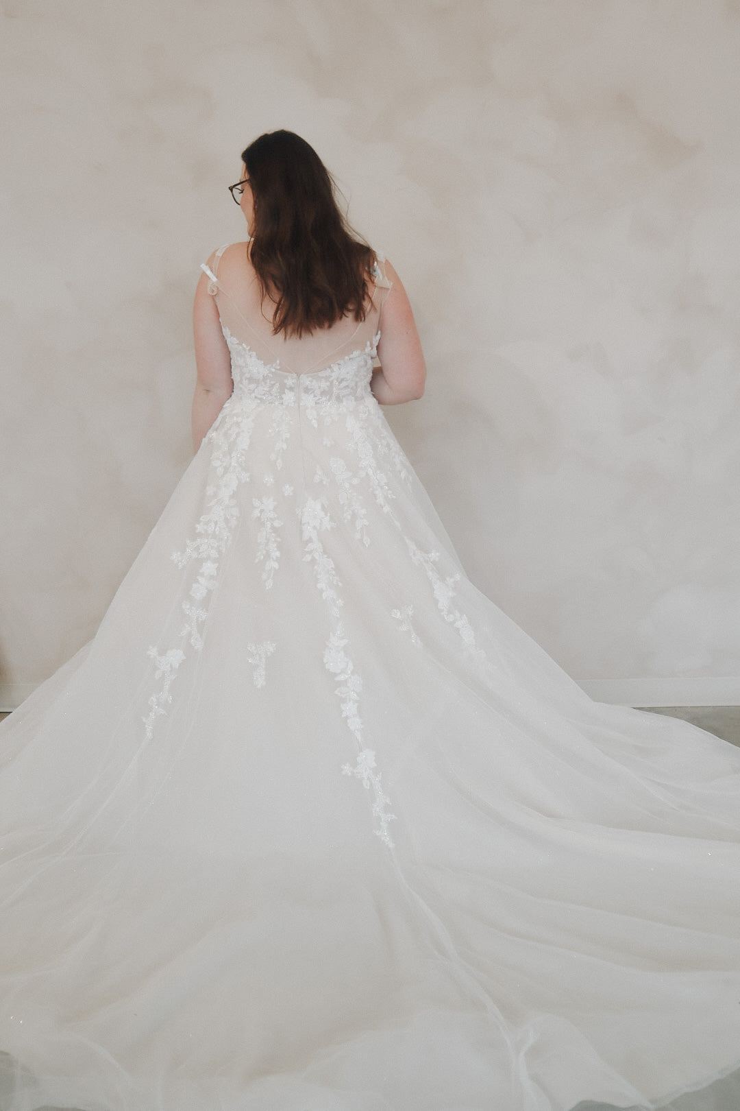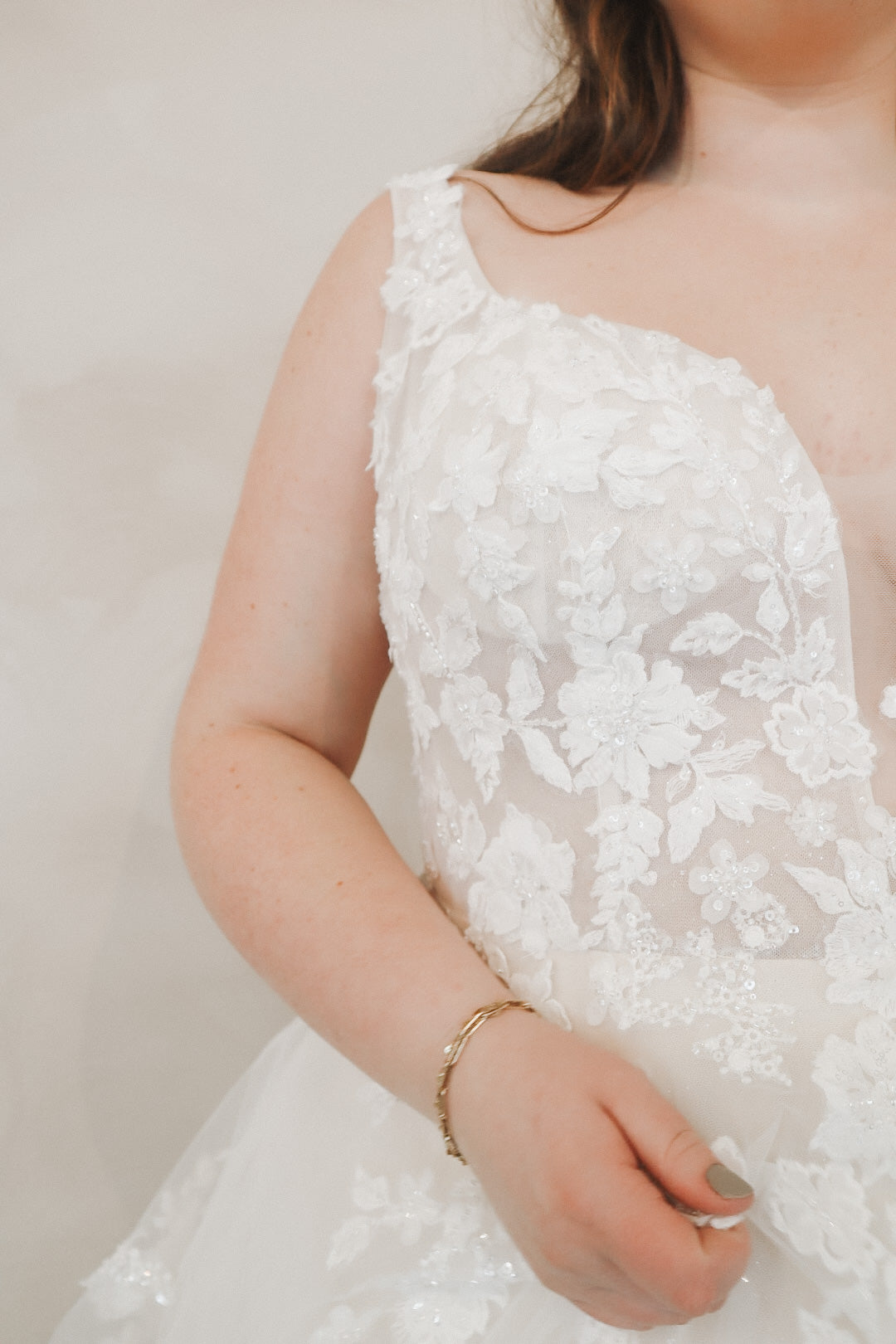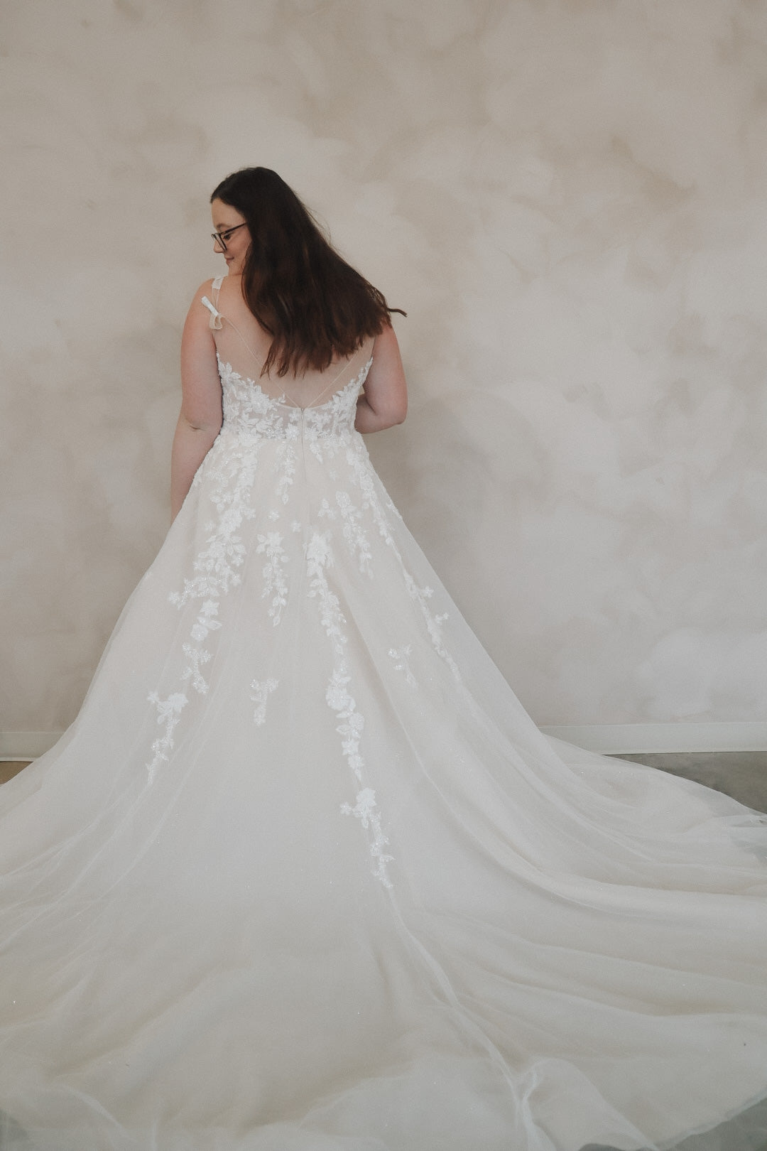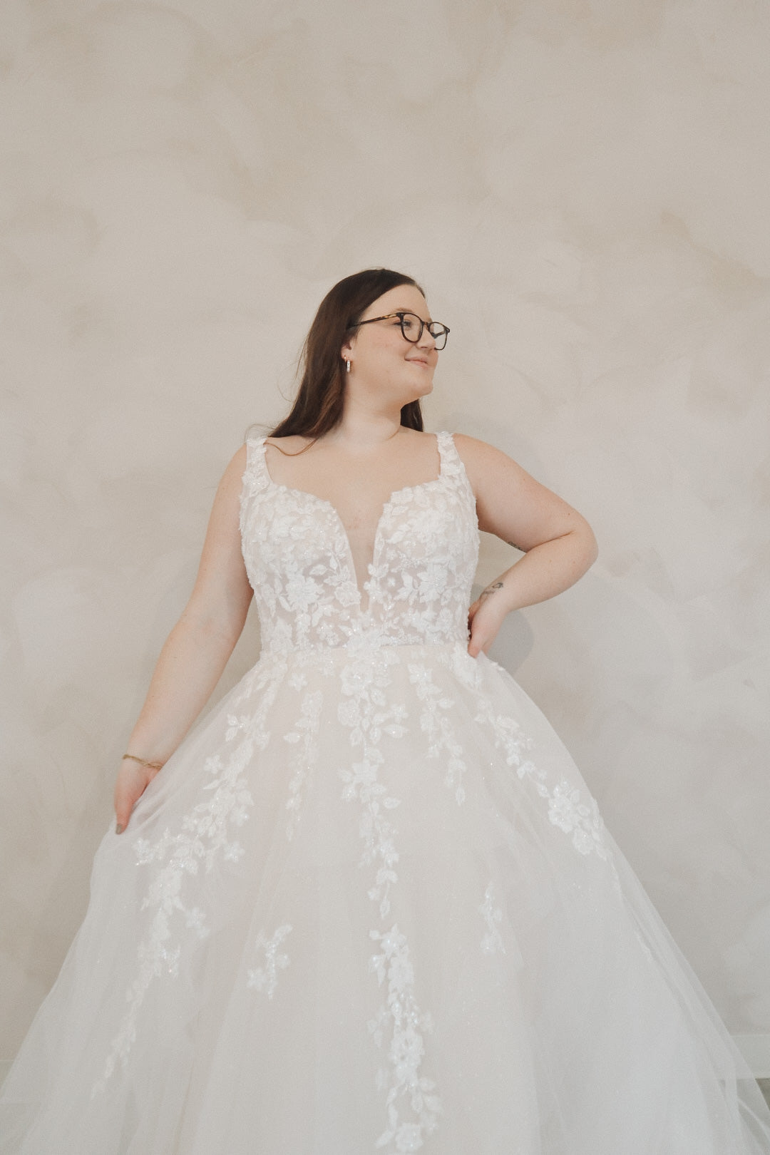 Introducing "Wrigley"- This dress is absolutely stunning, combining a romantic feel with a modern, flattering silhouette. The deep sweetheart neckline and intricate lace details give a soft and feminine vibe, while the voluminous tulle skirt adds drama and elegance. The flowy, ethereal design captures movement beautifully, making it a perfect choice for a bride who wants to feel both majestic and free-spirited on her big day. The mix of delicate lace and airy fabric creates a magical, timeless look—perfect for a fairytale wedding.