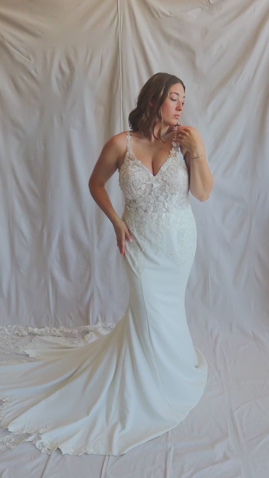 Introducing "Charlotte," a fitted wedding gown crafted from luxurious crepe. This gown features a flattering V-neckline and backline, adorned with delicate lace on the bodice for a touch of timeless elegance. The gown's highlight is its scalloped lace train, adding a romantic and graceful finish to Charlotte's silhouette.