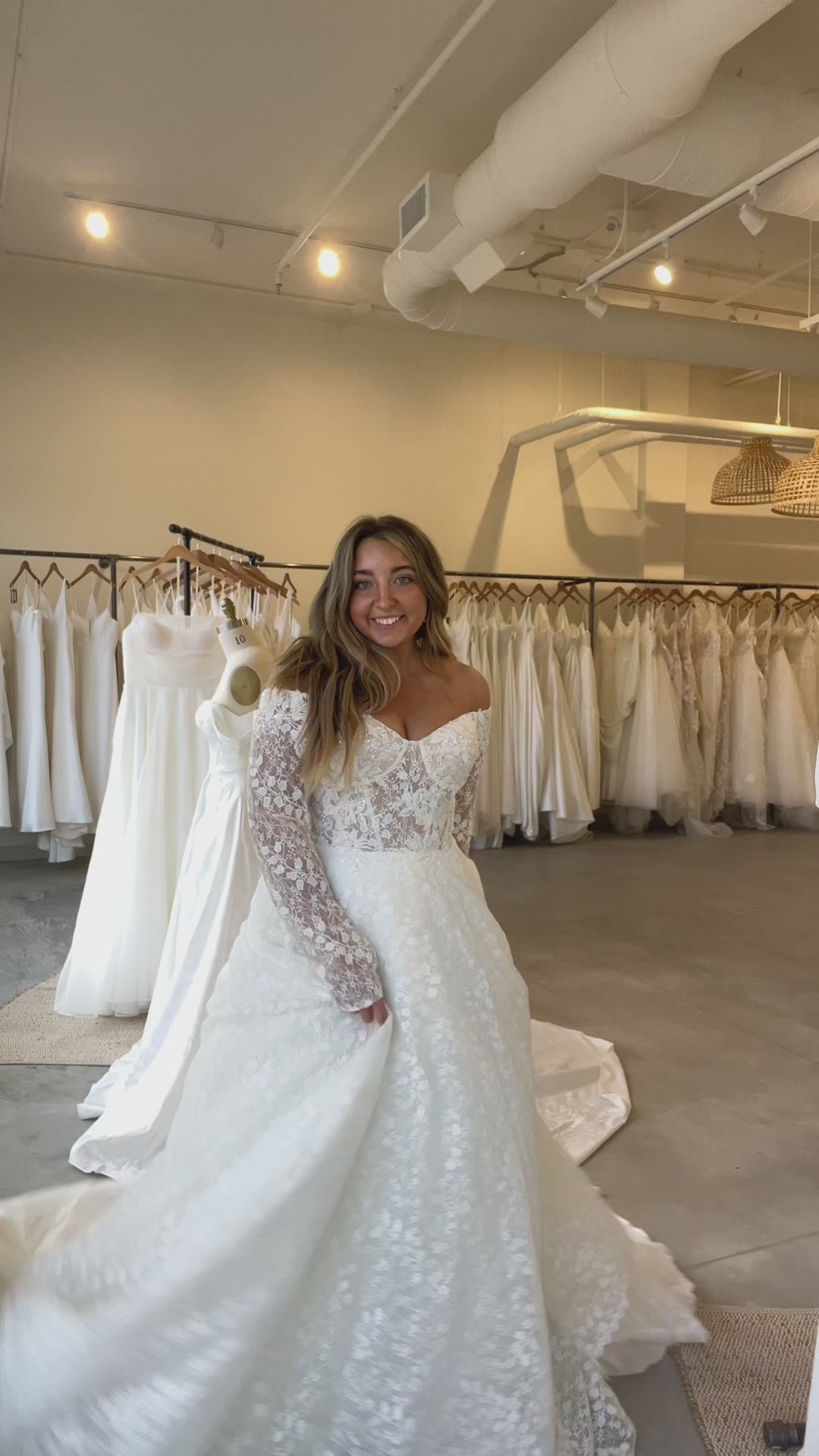 Introducing "Cleo"- This dress is a stunning fusion of classic elegance and modern romance. The off-the-shoulder neckline adds a soft, feminine touch, while the long lace sleeves create a vintage-inspired vibe that feels both timeless and on-trend. The intricate lace detailing throughout the dress gives it texture and depth, with a beautiful, flowing A-line skirt that offers a flattering silhouette. The lace continues down to the train, creating a romantic and dramatic finish. Ideal for a bride who wants a sophisticated yet ethereal look, this gown will make you feel elegant and graceful on your special day.