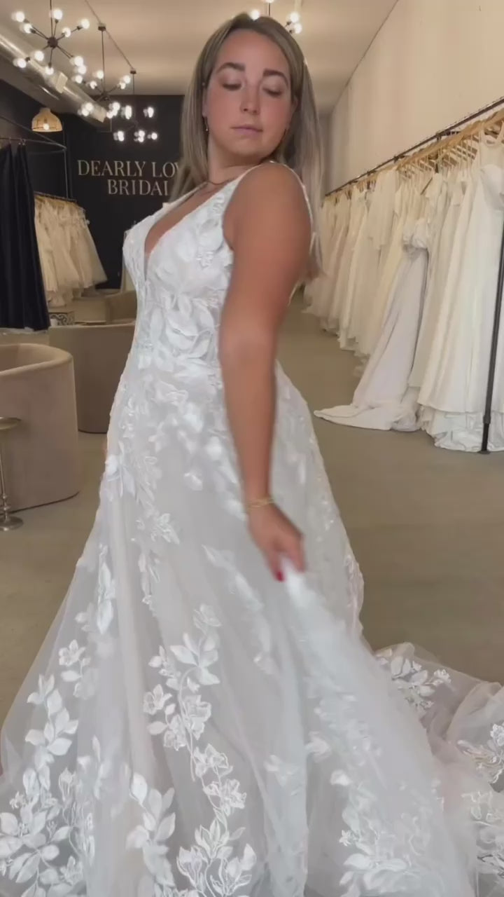 Introducing "Drew," an A-line wedding gown adorned with intricate lace appliqué throughout. This gown has a deep V-neckline and an alluring open back, exuding timeless romance and modern sophistication. Completing the look is a long flowing train that adds a touch of grandeur, making "Drew" the perfect choice for the bride who dreams of elegance and enchantment on her wedding day.
