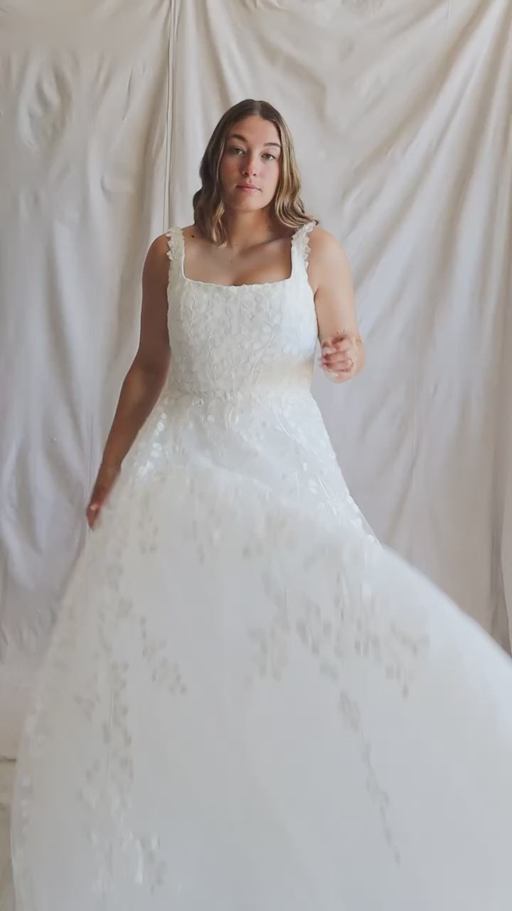 Introducing "Logan," a stunning A-line wedding dress that embodies natural beauty and timeless elegance. Crafted with a square neckline and adorned with delicate leafy lace detail throughout, this gown exudes a romantic and ethereal charm. The A-line silhouette flatters every figure, while the intricate lace adds texture and dimension, creating a whimsical yet sophisticated look. Logan is perfect for the bride seeking a blend of organic charm and classic grace on her special day.
