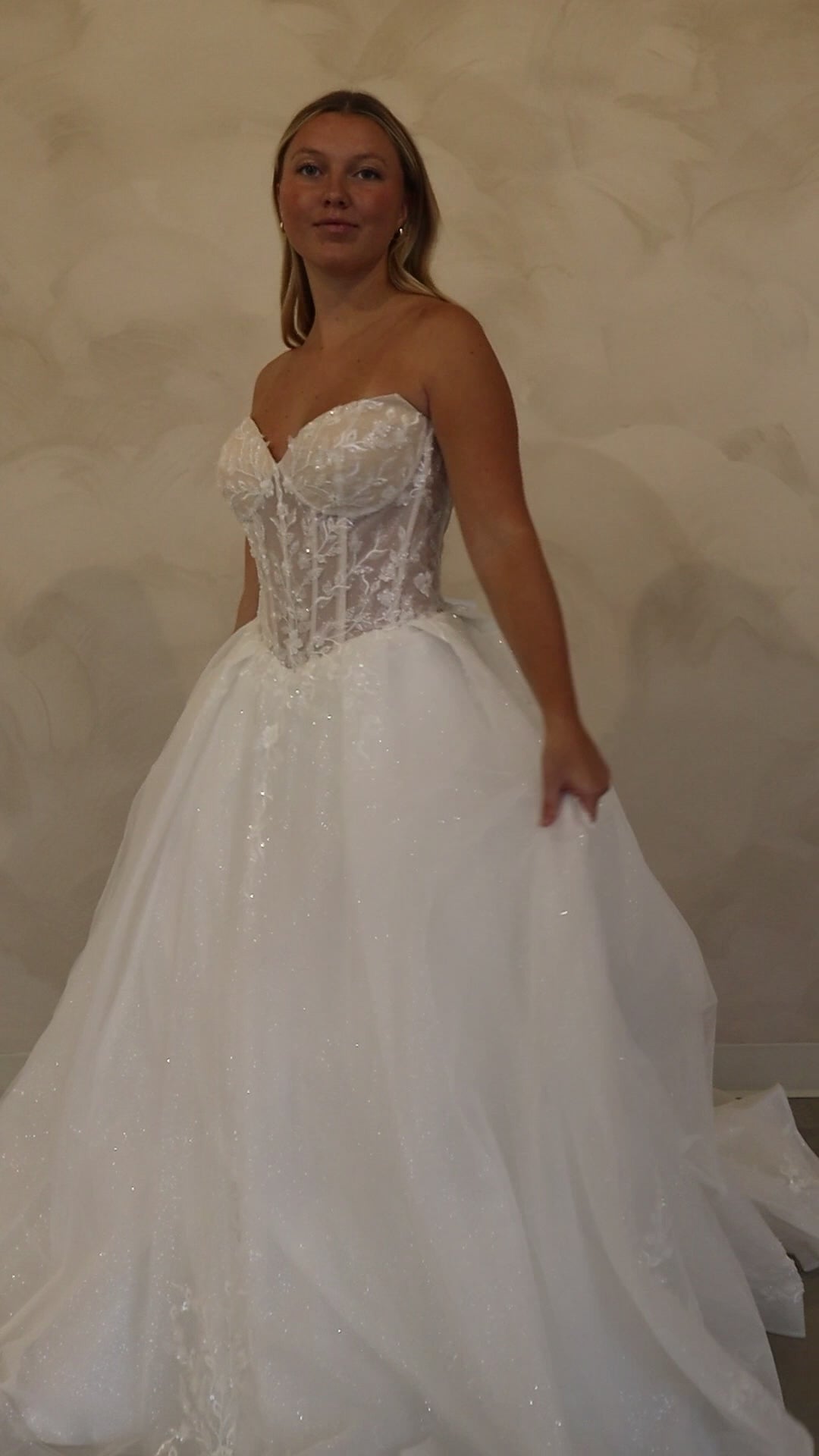 The Lux wedding dress is the modern princess gown. Featuring a classic strapless sweetheart dropped waist bodice finishing in a trendy dropped v front. The exposed boned corset is layered with a romantic combination organza, tulle and lace applique. The voluminous tulle skirt features deep knife pleats decorated in beaded lace applique.
