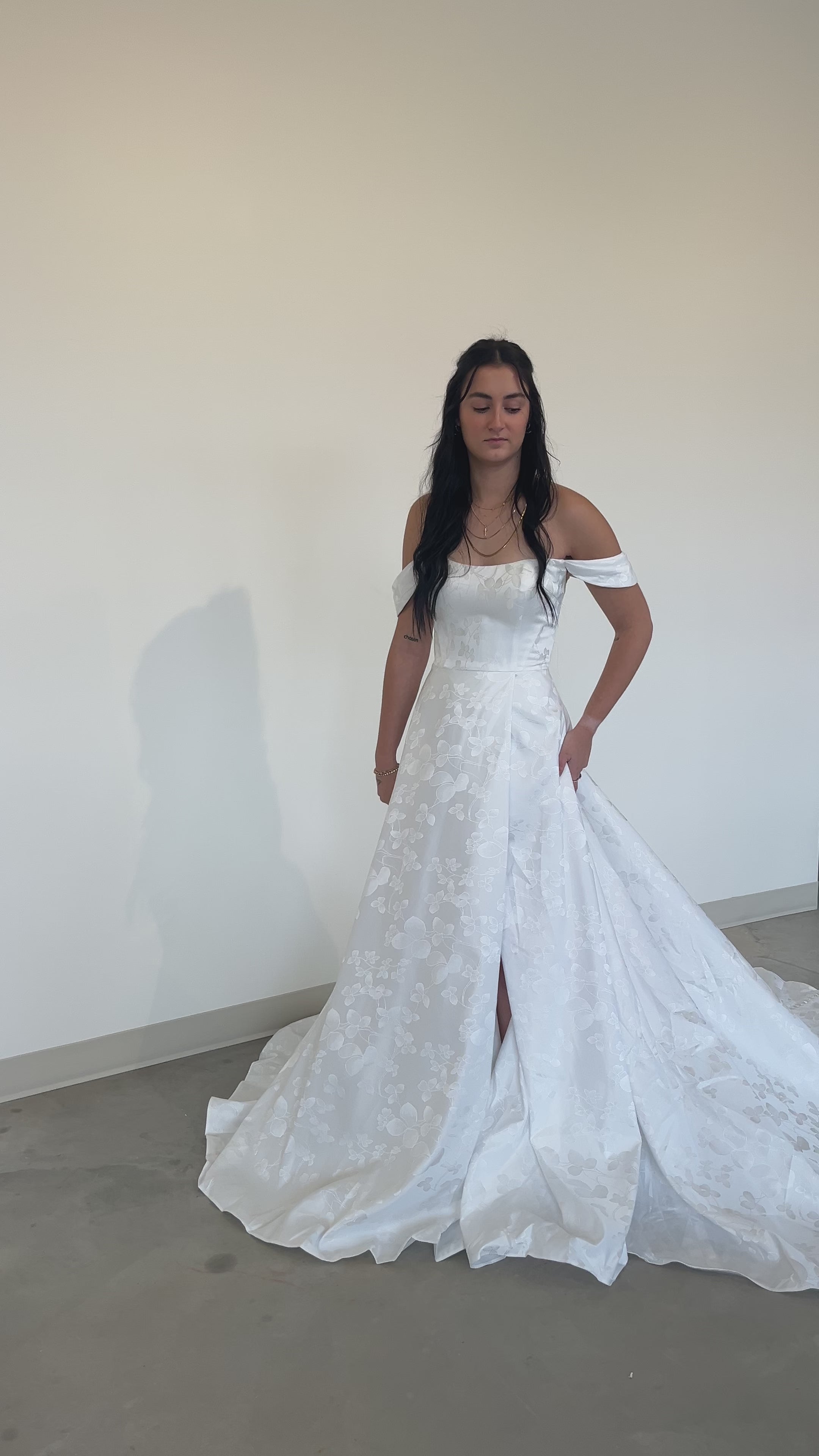 Introducing "Mae." Mae is an aline wedding dress that has a floral, satin, jacquard lace throughout. Mae features a scoop neckline with off the shoulder straps. Mae is complete with a full skirt and features a slit, as well as a stunning train with buttons down the back. This one layer wedding dress is perfect for the bride who dreams of comfort and class.