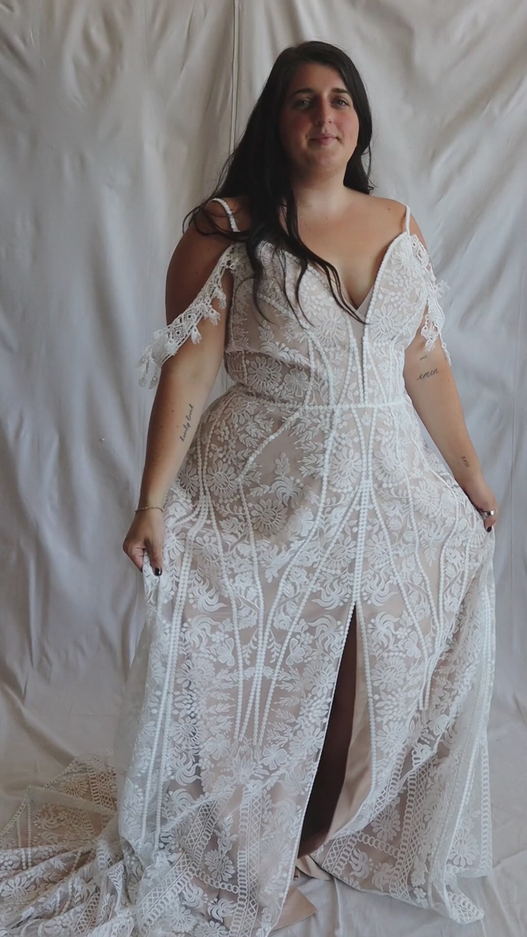 Introducing "Mara," a captivating boho wedding dress that blends intricate lace detailing with modern allure. Its deep V-neckline and open back exude romantic charm, while a slit up the center adds a touch of elegance. With detachable off-the-shoulder straps for added versatility, Mara is designed for the bride who embraces both tradition and free-spirited adventure, ensuring her special day is as uniquely beautiful as her love story.