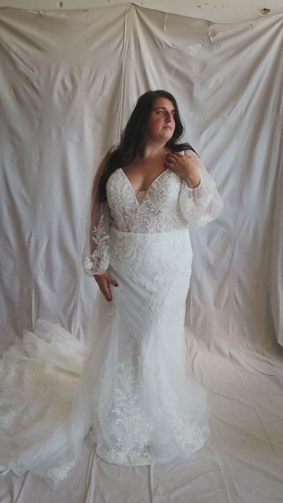 Introducing "Ruby," a mesmerizing wedding dress designed to captivate hearts. This fitted gown showcases exquisite all-over lace with beaded detailing, creating a shimmering effect that enhances its timeless elegance. The V-neckline and open back reveal a hint of allure and sophistication, while a Chantilly lace underlay adds depth and texture to the design. Completing the look is a flowing sweep train that adds a touch of romance and drama, making Ruby the perfect choice for the bride who dreams of a classic yet enchanting wedding day ensemble.