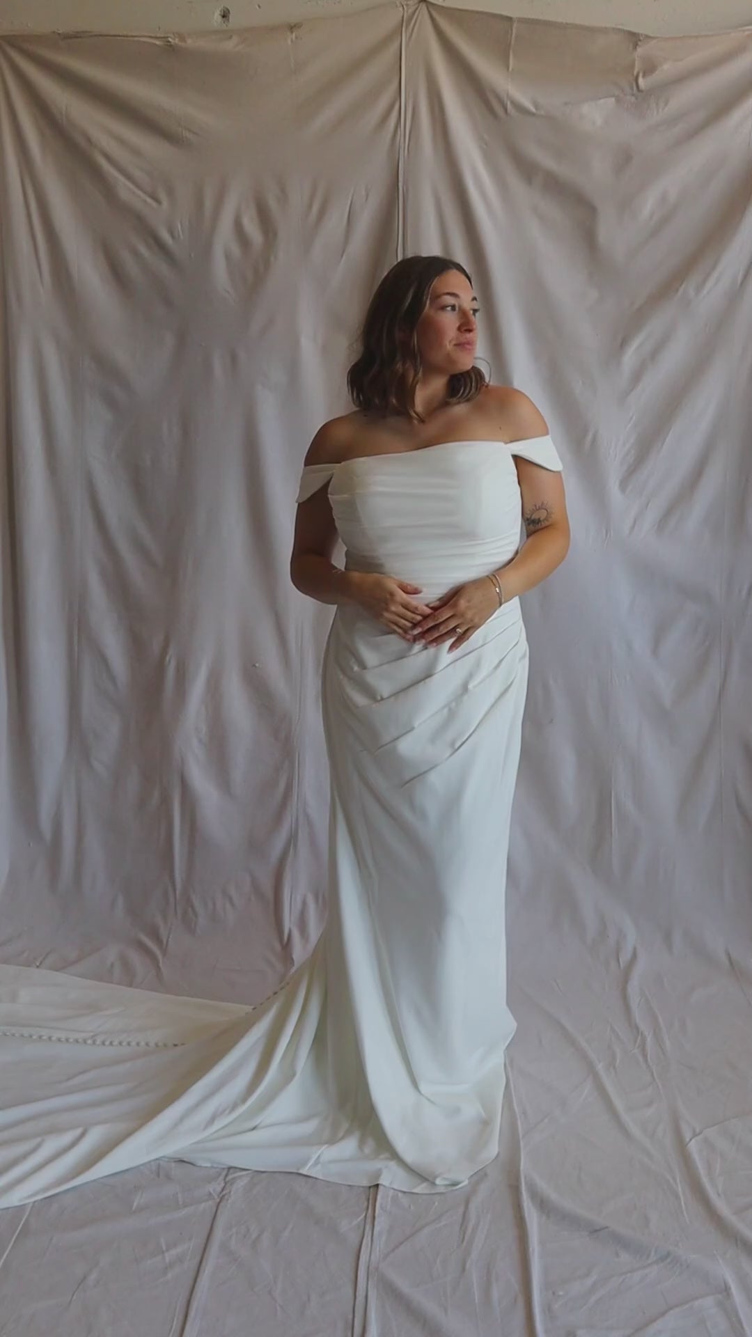 Introducing "Scottie," a stunning wedding dress that epitomizes modern sophistication. Crafted from luxurious crepe, this fitted gown showcases exquisite ruching across the bodice and skirt, accentuating the bride's silhouette with effortless elegance. Off-the-shoulder detailing adds a touch of romance and allure, while buttons down the train provide a classic and elegant finishing touch. Scottie is the perfect choice for the bride seeking a chic and timeless look with a hint of glamour on her special day.