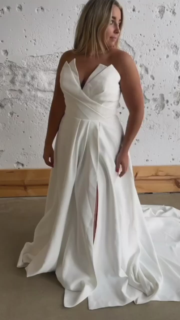"Serena" epitomizes sophistication and allure, blending soft satin with a modern A-line silhouette. The gown features an asymmetrical V-neckline and a daring high slit, balanced by a luxurious long train adorned with buttons. Its corset mesh back adds a touch of romance and support, ensuring every bride feels radiant and distinctive on her wedding day. This dress is a timeless choice, crafted to create cherished memories and captivate all who behold its beauty.