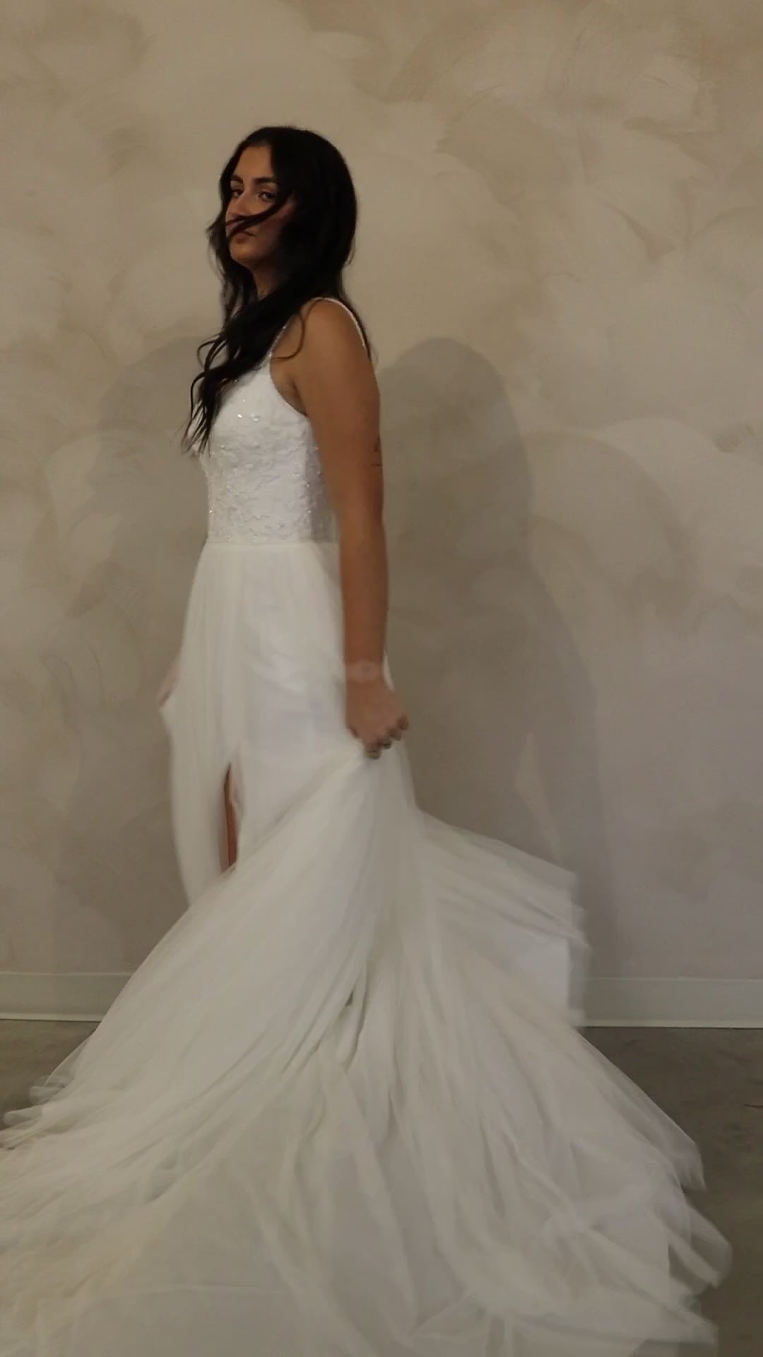 Lilas embodies timeless elegance in vintage white. With delicate beaded lace and soft tulle, it exudes sophistication for the modern bride. Thin beaded straps lead to a captivating plunge neckline, while the intricately beaded bodice adds glamour. Built-in bra cups and boning ensure comfort and support, while the A-line skirt flows gracefully. Featuring a beaded cross-over back strap and invisible zipper, Lilas epitomizes understated elegance.