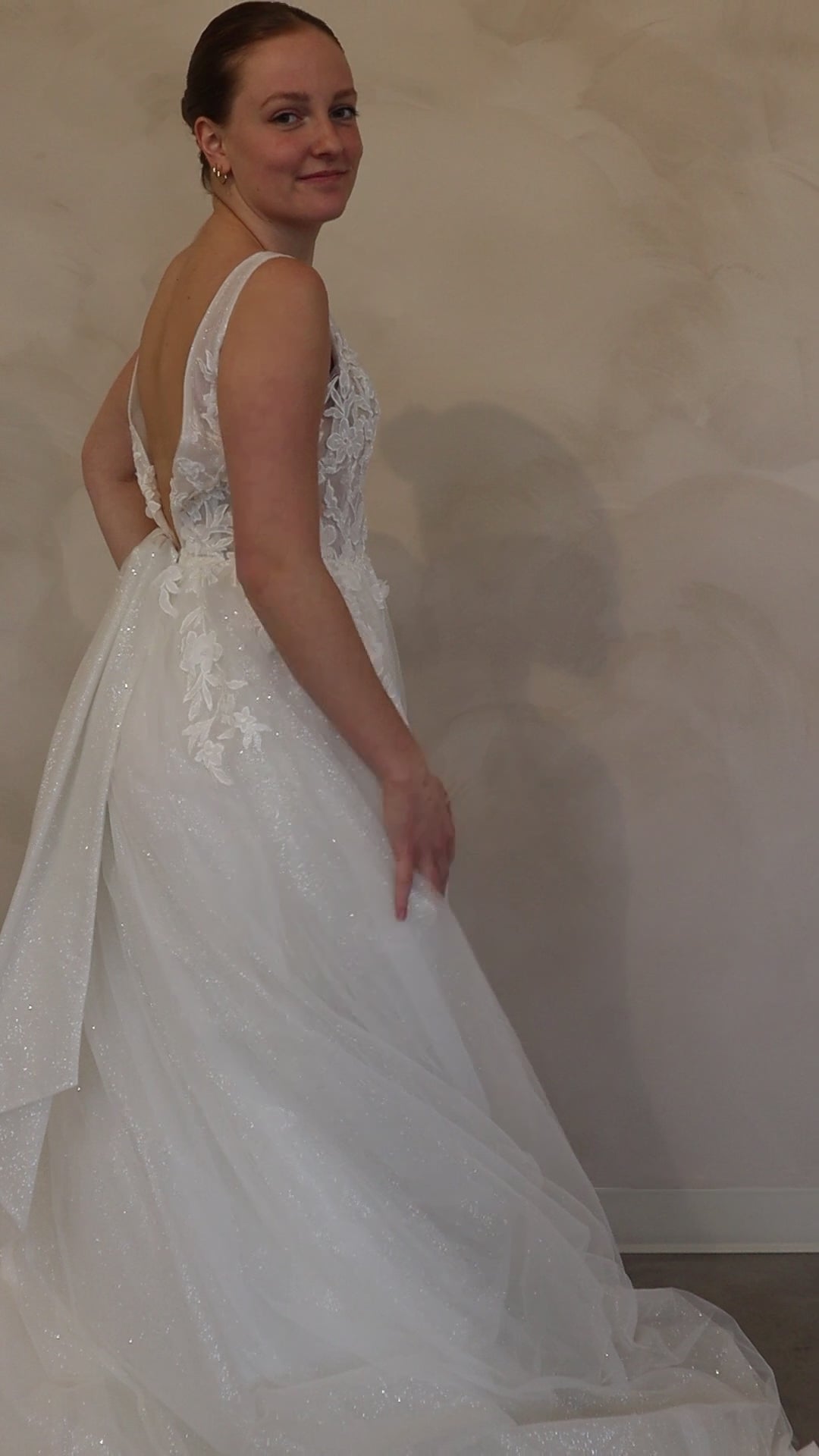 The Tara wedding dress is a timeless A-line silhouette. Featuring an illusion plunging v-neck bodice with delicate 3D botanical lace applique adorned with pearls that cascade from the thick straps through to the hip. The voluminous glitter tulle skirt is finished with a crinoline hem and romantic cathedral train.