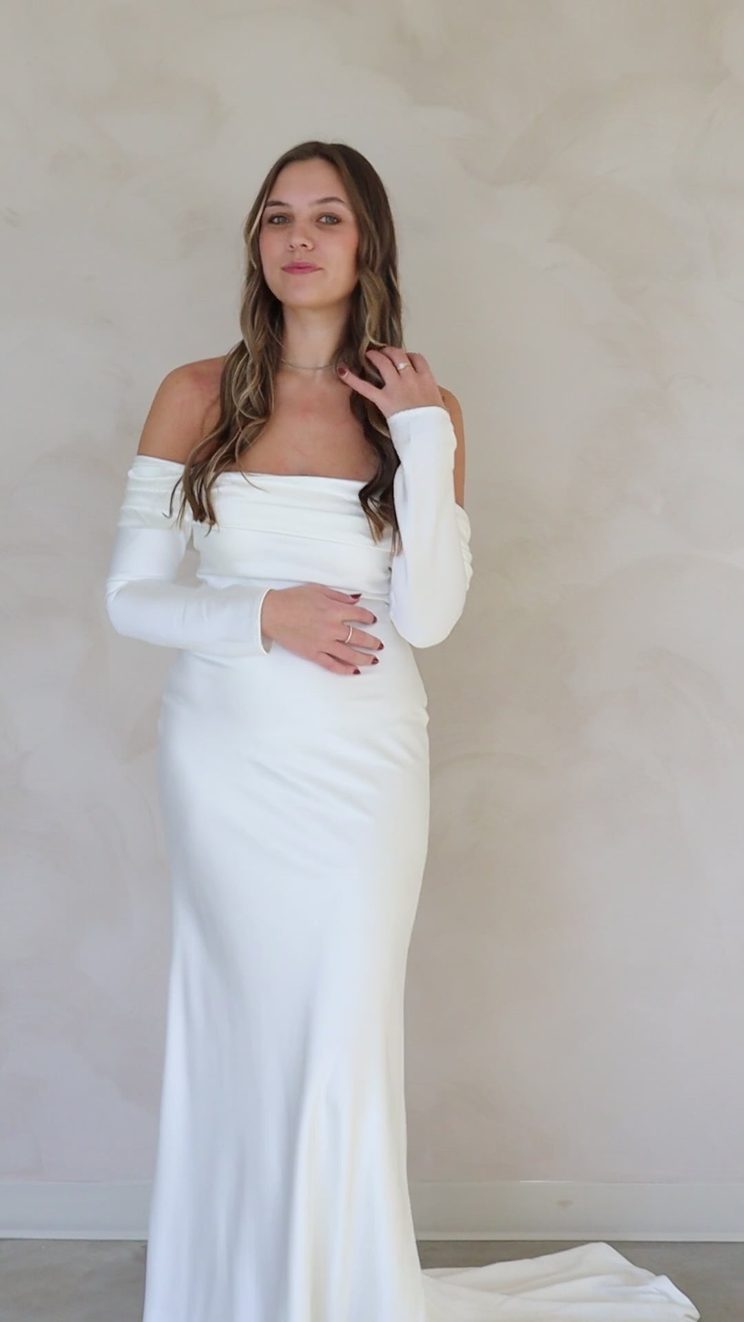 The Asha wedding dress features a modern bias cute straight silhouette with a draped off the shoulder neckline finished with long sleeves and spaghetti straps. Her slinky skirt finishes in a romantic sweep train.