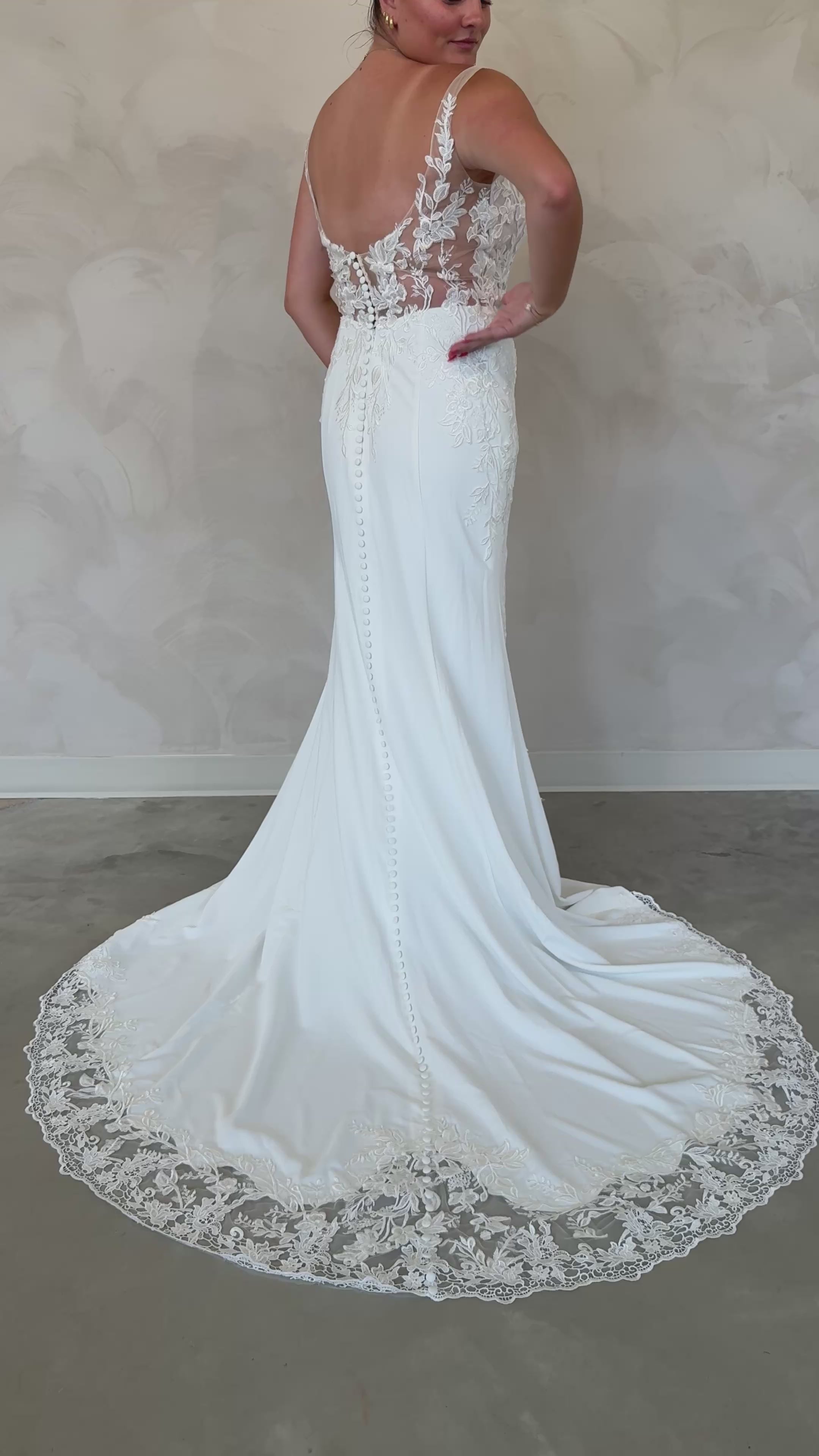 Introducing "Charlene," a gorgeous lace and crepe gown that brings both simple and sophistication. Starting from the classic shoulder straps that seamlessly dip to form a V-neckline of floral lace, the tailored sheer bodice highlights the natural figure to meet an opaque crepe skirt. Hip hugging lace placement, along with the row of fabric-covered buttons, draw the eyes down the length of the skirt to the organic floral lace-cut out train for a striking finishing touch.