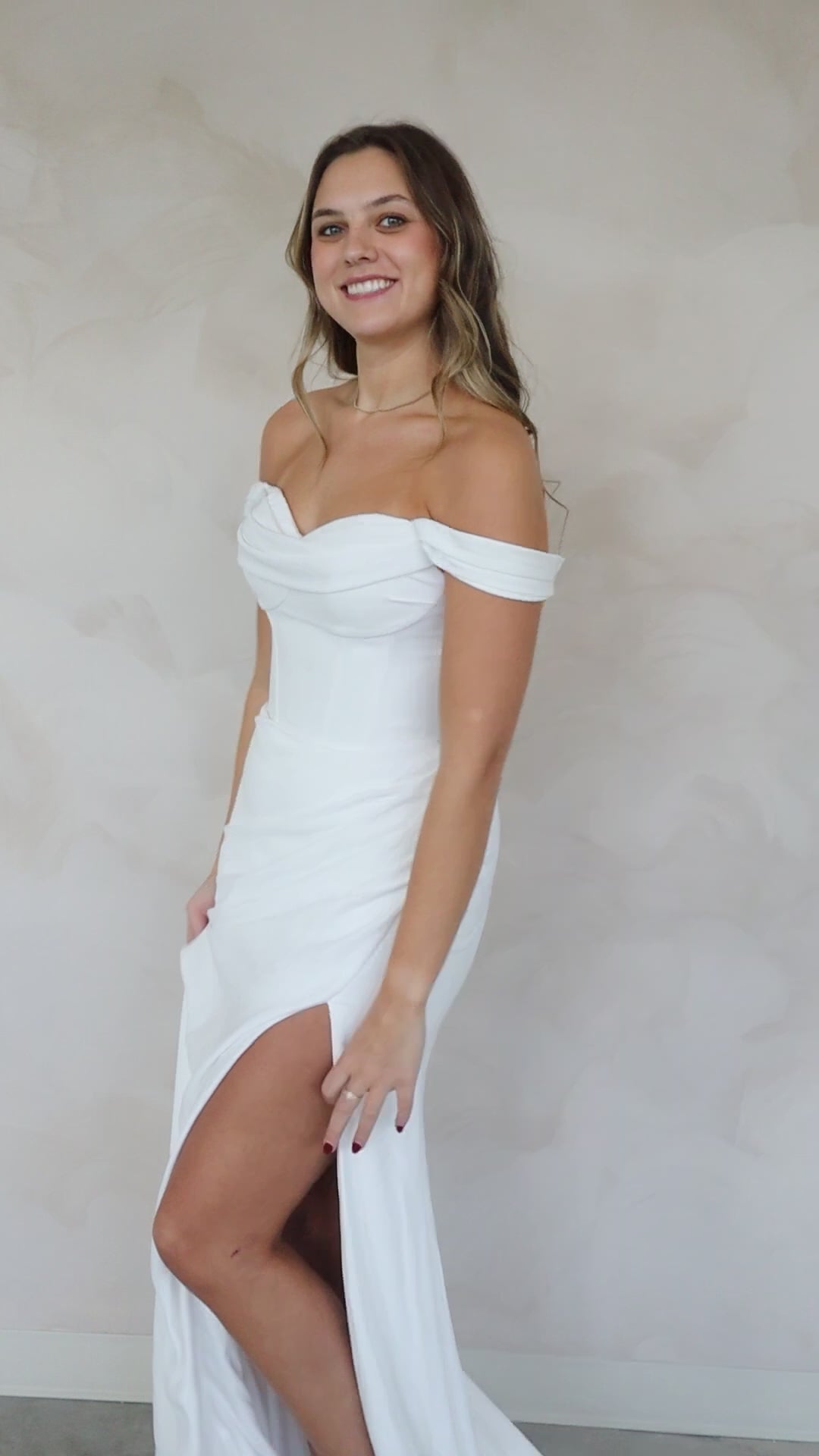 Off-the-shoulder sleeves enhance the romantic feel, while a soft V-back with an invisible zipper, loop, and buttons adds sophistication. The fitted mermaid silhouette is accentuated by a thigh-high split and pleating from the left hip. With exposed boning and bra cups for support, this gown also features a court-length train, making it perfect