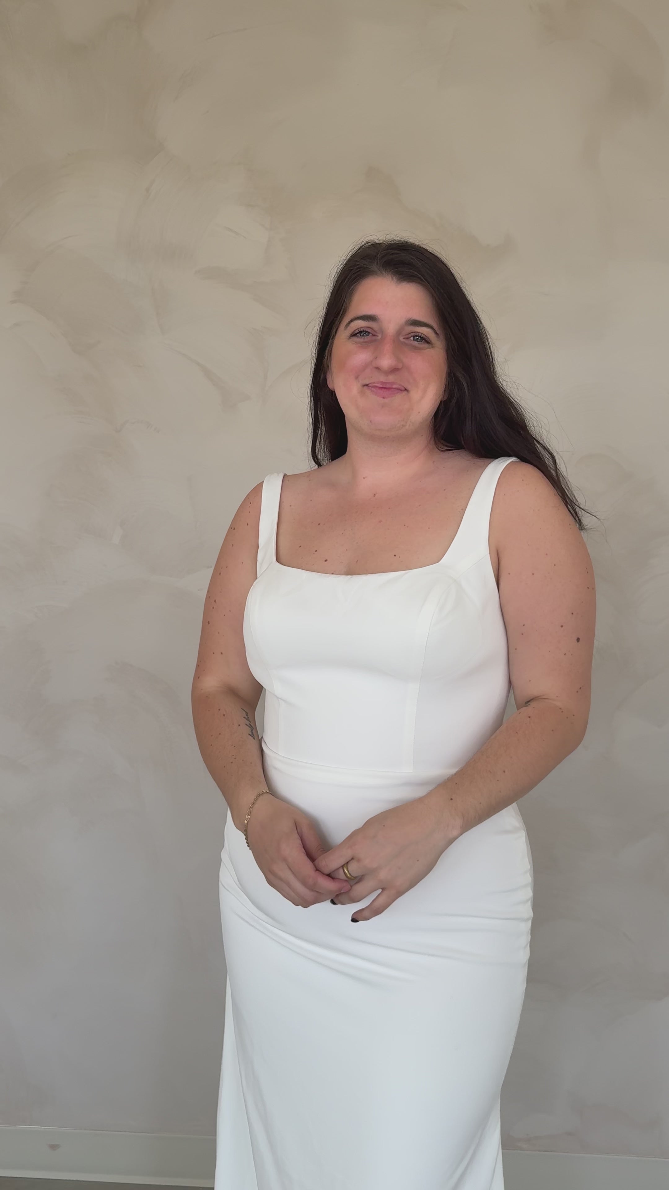 Meet "Archie," a chic wedding gown in luxurious crepe, designed to accentuate every curve with elegance. This fitted silhouette features a flattering square neckline, complemented by a low V-back and a sweeping train, blending modern sophistication with timeless allure for a bride who seeks understated glamour on her special day.
