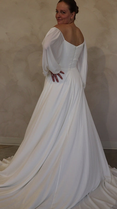 Introducing "Vinny"- This dress is effortlessly graceful, with its off-shoulder sleeves adding a romantic touch to the classic silhouette. The long, flowing fabric creates a soft, elegant look while the voluminous sleeves lend a sense of drama and femininity. The simplicity of the design paired with the delicate train makes it a perfect option for a bride who loves timeless elegance with a subtle modern twist. The structure at the top is flattering, and the skirt flows beautifully, perfect for a wedding day that feels both refined and dreamy.
